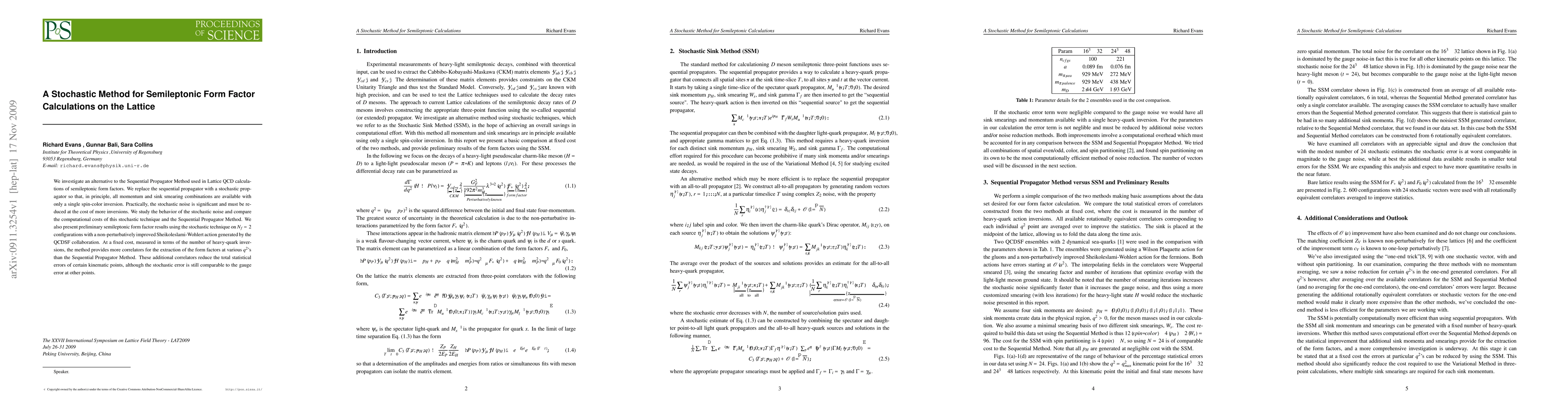We investigate an alternative to the Sequential Propagator Method used in Lattice QCD calculations of semileptonic form factors. We replace the sequential propagator with a stochastic propagator so that, in principle, all momentum and sink smearing combinations are available with only a single spin-color inversion. Practically, the stochastic noise is significant and must be reduced at the cost of more inversions. We study the behavior of the stochastic noise and compare the computational costs of this stochastic technique and the Sequential Propagator Method. We also present preliminary semileptonic form factor results using the stochastic technique on N_f=2 configurations with a non-perturbatively improved Sheikoleslami-Wohlert action generated by the QCDSF collaboration. At a fixed cost, measured in terms of the number of heavy-quark inversions, the method provides more correlators for the extraction of the form factors at various q^2's than the Sequential Propagator Method. These additional correlators reduce the total statistical errors of certain kinematic points, although the stochastic error is still comparable to the gauge error at other points.