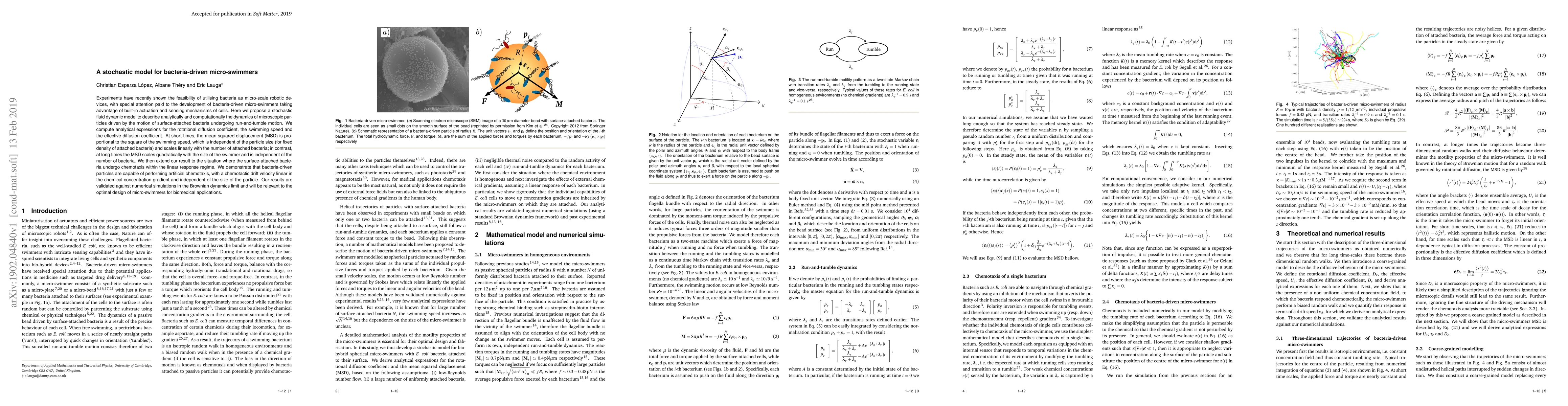 This paper proposes a stochastic model to analyze bacteria-driven micro-swimmers, deriving analytical expressions for their dynamics, including speed and diffusion coefficients. The model shows that the mean squared displacement scales differently with time and particle size, and extends to chemotactic behavior, validated by numerical simulations.