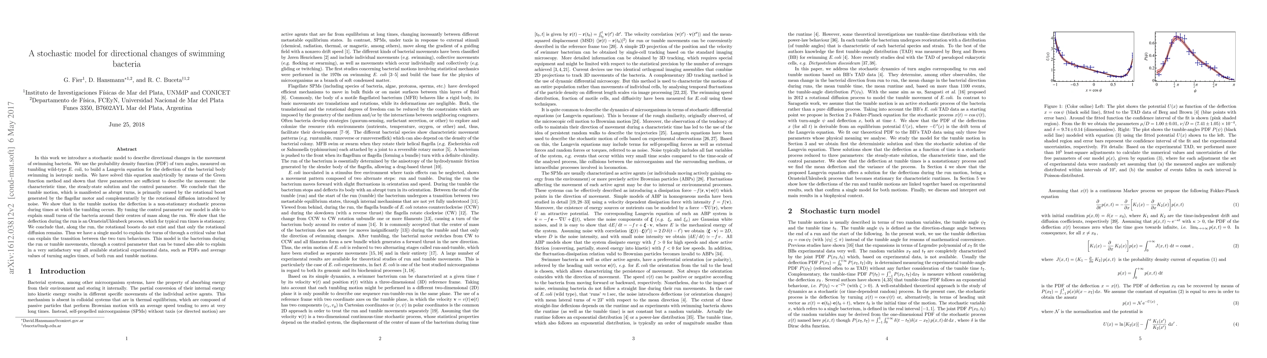 In this work we introduce a stochastic model to describe directional changes in the movement of swimming bacteria. We use the probability density function (PDF) of turn angles, measured on tumbling wild-type {\it E. coli}, to build a Langevin equation for the deflection of the bacterial body swimming in isotropic media. We have solved this equation analytically by means of the Green function method and shown that three parameters are sufficient to describe the movement: the characteristic time, the steady-state solution and the control parameter. We conclude that the tumble motion, which is manifested as abrupt turns, is primarily caused by the rotational boost generated by the flagellar motor and complementarily by the rotational diffusion introduced by noise. We show that in the tumble motion the deflection is a non-stationary stochastic process during times at which the tumbling occurs. By tuning the control parameter our model is able to explain small turns of the bacteria around their centres of mass along the run. We show that the deflection during the run is an OrnsteinUhlenbeck process, which for typical run times is stationary. We conclude that, along the run, the rotational boosts do not exist and that only the rotational diffusion remains. Thus we have a single model to explain the turns of through a critical value that can explain the transition between the two turn behaviours. This model is the bacterium during the run or tumble movements, through a control parameter that can be tuned also able to explain in a very satisfactory way all available statistical experimental data, such as PDFs and average values of turning angles times, of both run and tumble motions.