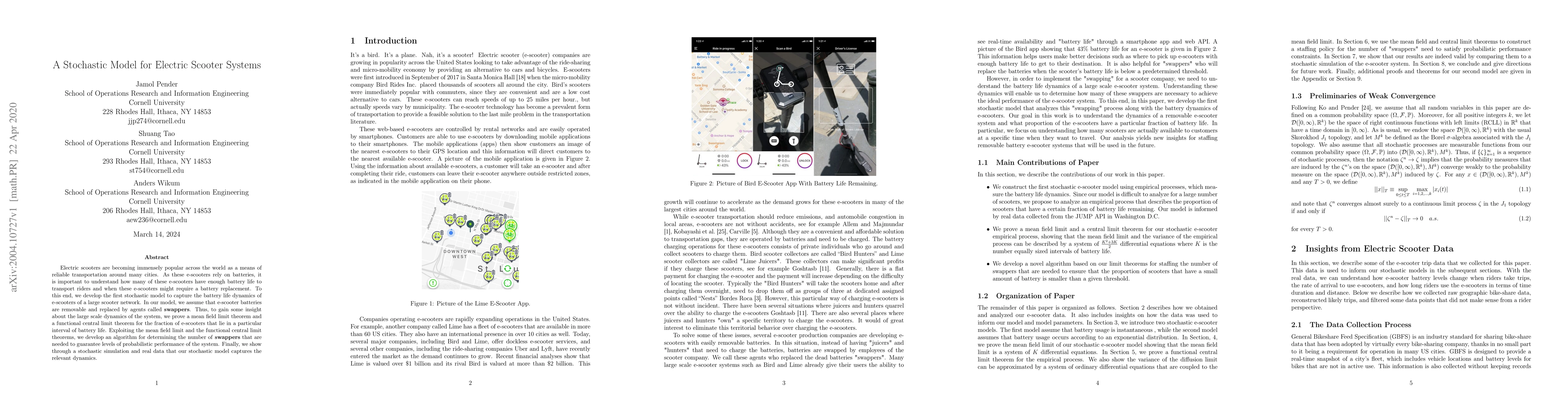 Electric scooters are becoming immensely popular across the world as a means of reliable transportation around many cities. As these e-scooters rely on batteries, it is important to understand how many of these e-scooters have enough battery life to transport riders and when these e-scooters might require a battery replacement. To this end, we develop the first stochastic model to capture the battery life dynamics of e-scooters of a large scooter network. In our model, we assume that e-scooter batteries are removable and replaced by agents called swappers. Thus, to gain some insight about the large scale dynamics of the system, we prove a mean field limit theorem and a functional central limit theorem for the fraction of e-scooters that lie in a particular interval of battery life. Exploiting the mean field limit and the functional central limit theorems, we develop an algorithm for determining the number of swappers that are needed to guarantee levels of probabilistic performance of the system. Finally, we show through a stochastic simulation and real data that our stochastic model captures the relevant dynamics.