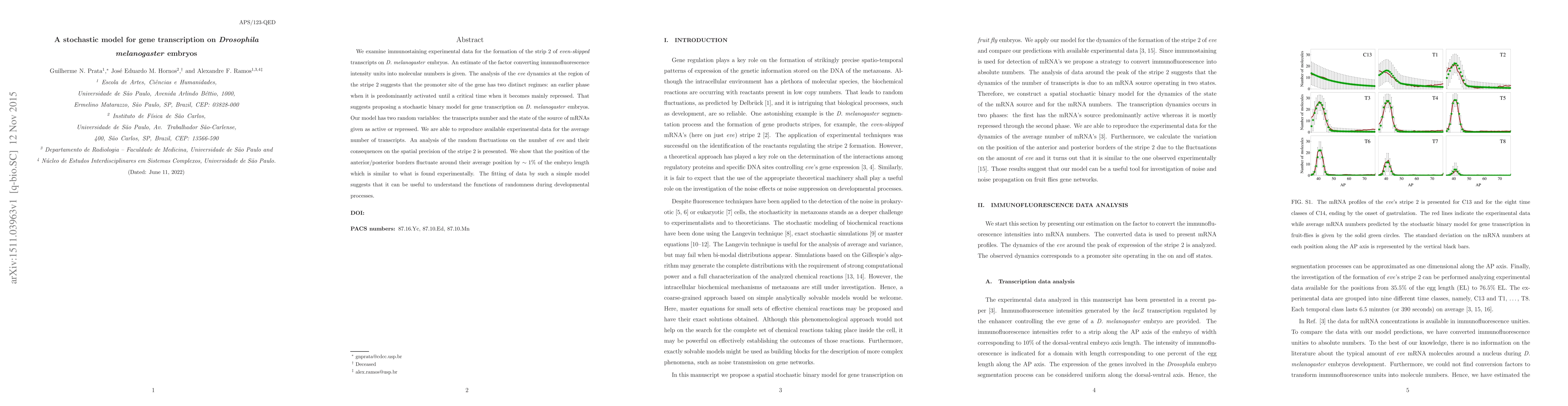 We examine immunostaining experimental data for the formation of the strip 2 of $even-skipped$ ($eve$) transcripts on $D.$ $melanogaster$ embryos. An estimate of the factor converting immunofluorescence intensity units into molecular numbers is given. The analysis of the $eve$ mRNA's dynamics at the region of the stripe 2 suggests that the promoter site of the gene has two distinct regimes: an earlier phase when it is predominantly activated until a critical time when it becomes mainly repressed. That suggests proposing a stochastic binary model for gene transcription on $D.$ $melanogaster$ embryos. Our model has two random variables: the transcripts number and the state of the source of mRNAs given as active or repressed. We are able to reproduce available experimental data for the average number of transcripts. An analysis of the random fluctuations on the number of $eve$ mRNA's and their consequences on the spatial precision of the stripe 2 is presented. We show that the position of the anterior/posterior borders fluctuate around their average position by $\sim 1 \%$ of the embryo length which is similar to what is found experimentally. The fitting of data by such a simple model suggests that it can be useful to understand the functions of randomness during developmental processes.