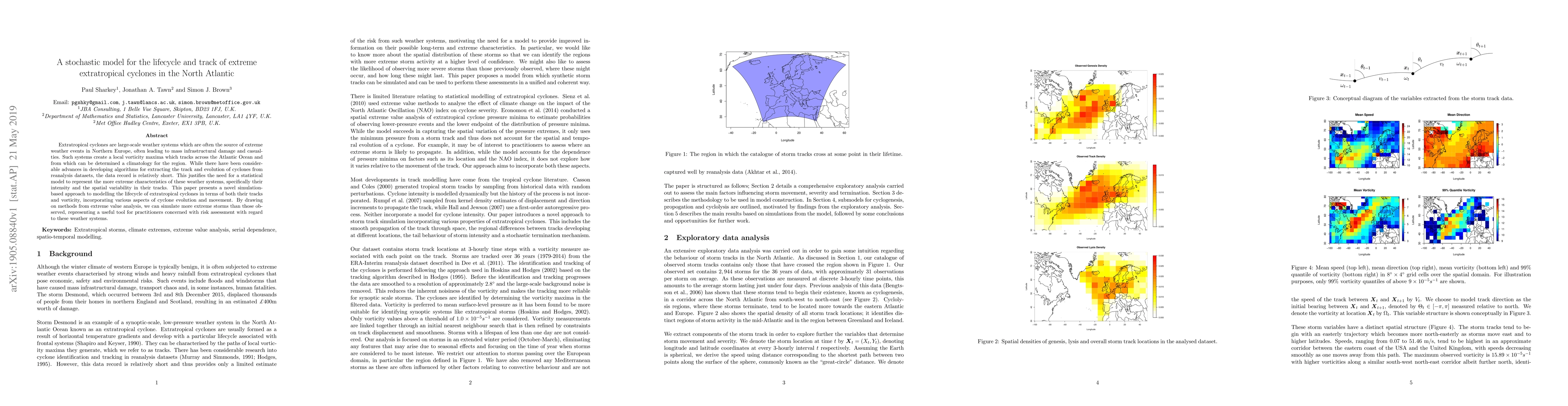 This paper introduces a stochastic model to simulate the lifecycle and track of extreme extratropical cyclones in the North Atlantic, focusing on their intensity and spatial variability. It employs extreme value analysis to generate more extreme storm simulations, providing valuable insights for risk assessment.