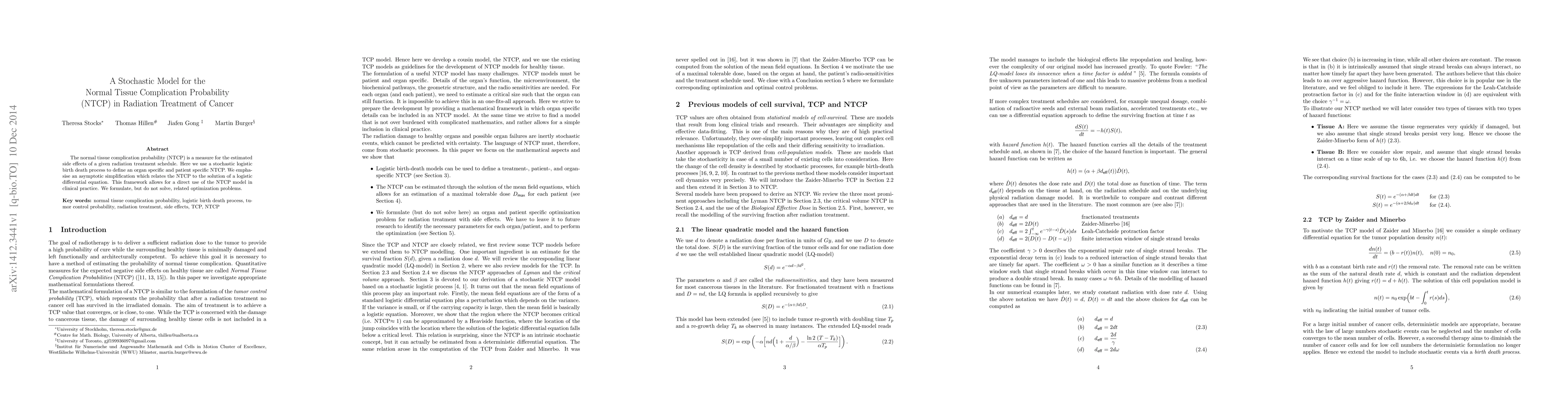 The normal tissue complication probability (NTCP) is a measure for the estimated side effects of a given radiation treatment schedule. Here we use a stochastic logistic birth death process to define an organ specific and patient specific NTCP. We emphasise an asymptotic simplification which relates the NTCP to the solution of a logistic differential equation. This framework allows for a direct use of the NTCP model in clinical practice. We formulate, but do not solve, related optimization problems.