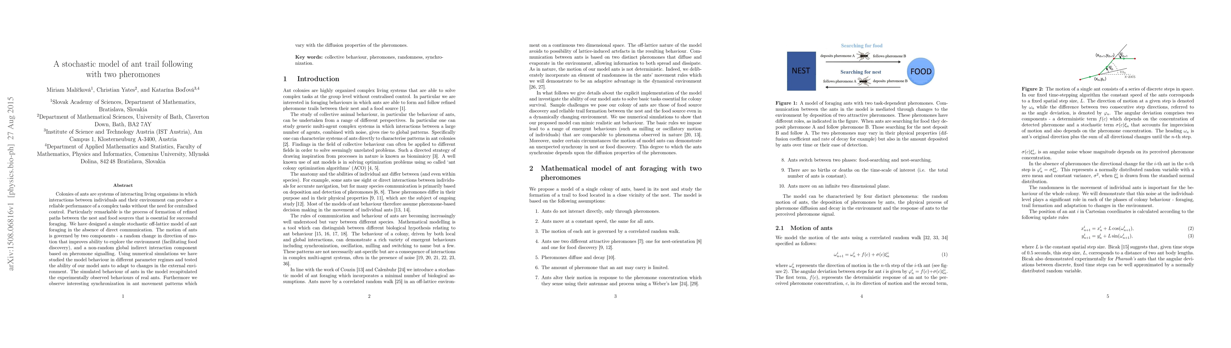 This paper presents a stochastic model of ant foraging behavior using two pheromones, demonstrating how ants can form efficient paths without centralized control. The model shows adaptability to environmental changes and reveals synchronization in ant movement patterns influenced by pheromone diffusion.