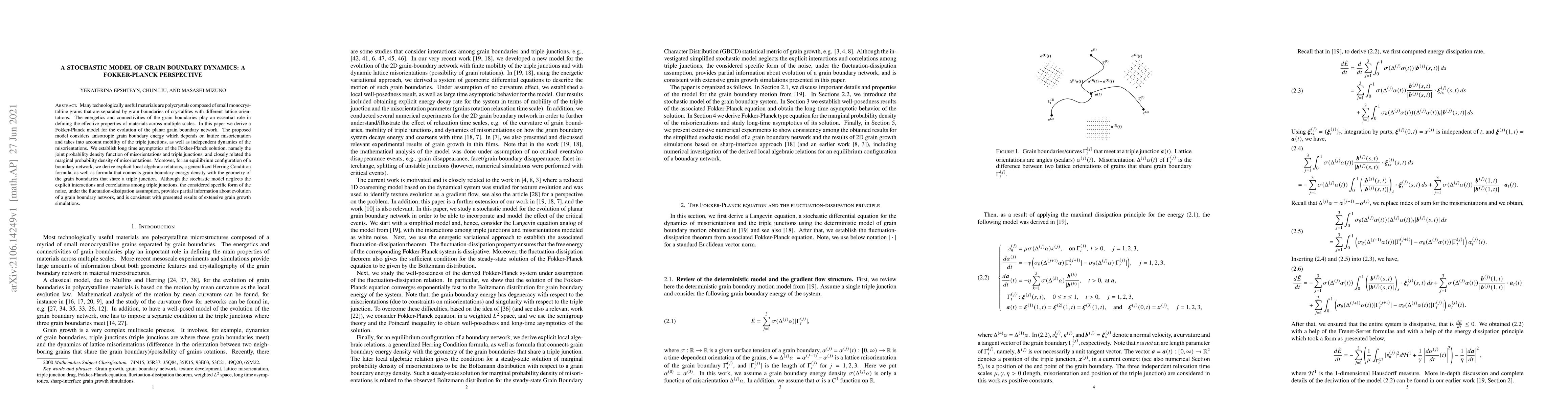This paper develops a Fokker-Planck model to describe the dynamics of grain boundary networks in polycrystalline materials, considering anisotropic energy and triple junction mobility. The study establishes long-time asymptotics and derives algebraic relations for equilibrium configurations, providing insights into grain boundary evolution.
