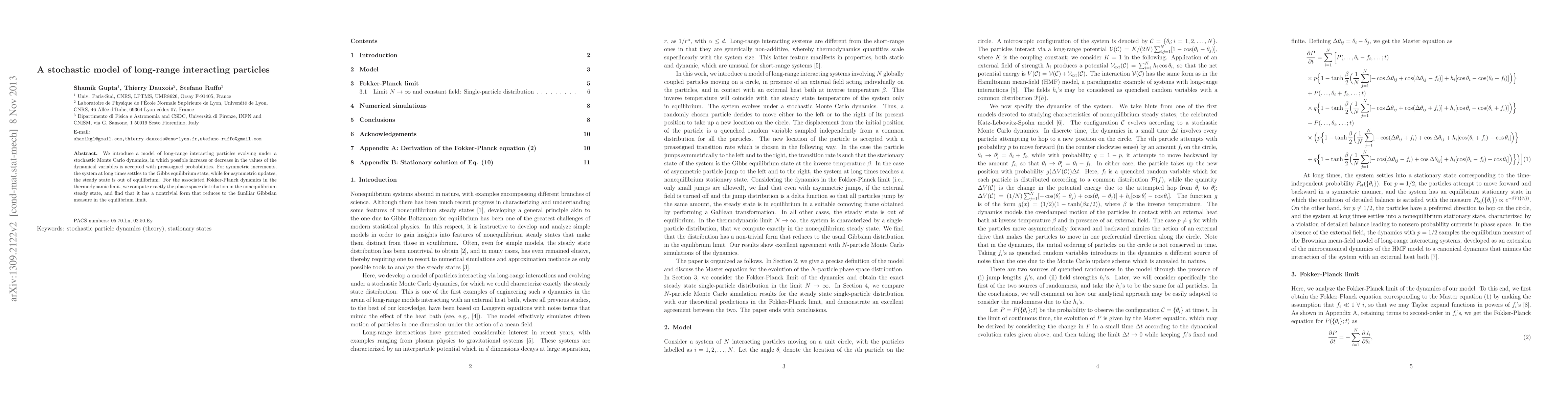 This paper presents a stochastic model for long-range interacting particles governed by Monte Carlo dynamics, showing that symmetric updates lead to Gibbs equilibrium while asymmetric updates result in a nontrivial nonequilibrium steady state with a phase space distribution distinct from the equilibrium Gibbs measure.