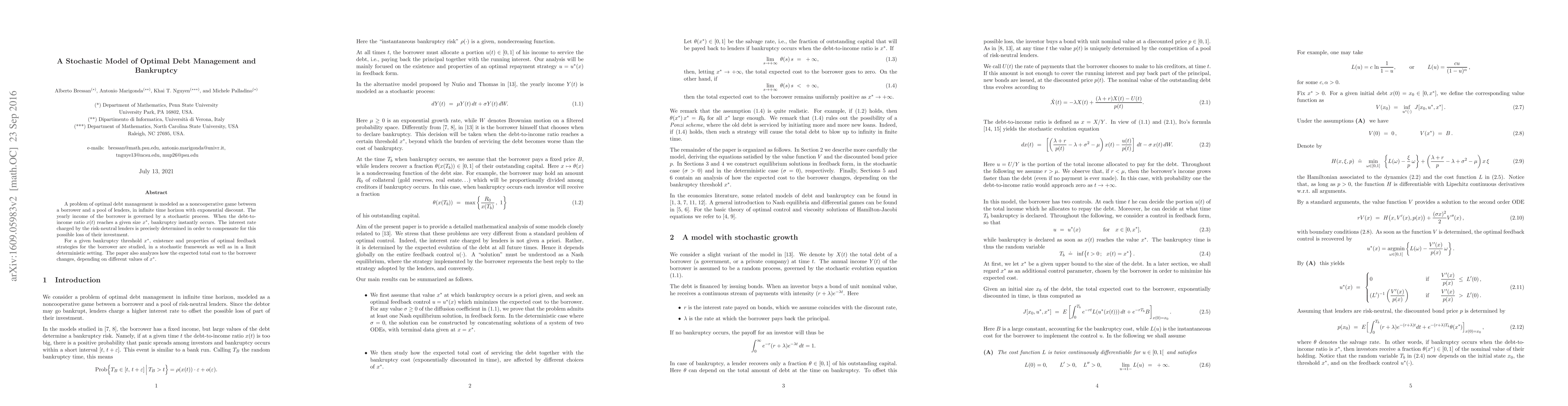 The paper presents a stochastic model for optimal debt management and bankruptcy, providing existence and properties of optimal strategies in both stochastic and deterministic settings.