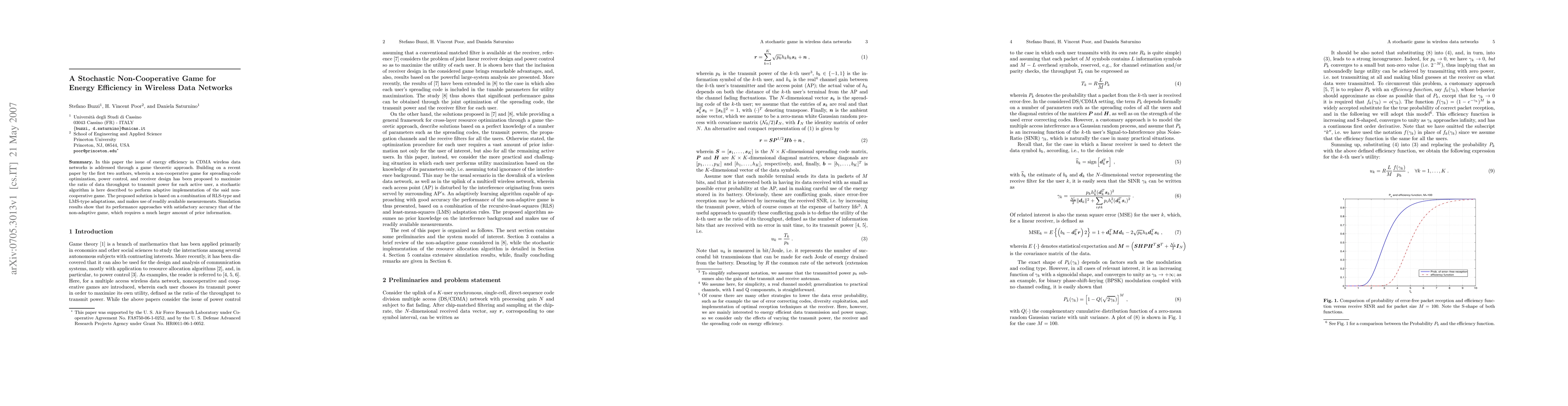 This paper proposes a stochastic non-cooperative game to optimize energy efficiency in CDMA wireless data networks, employing adaptive algorithms based on RLS-type and LMS-type adaptations. Simulation results indicate that the adaptive approach achieves performance close to that of a non-adaptive game, requiring less prior information.