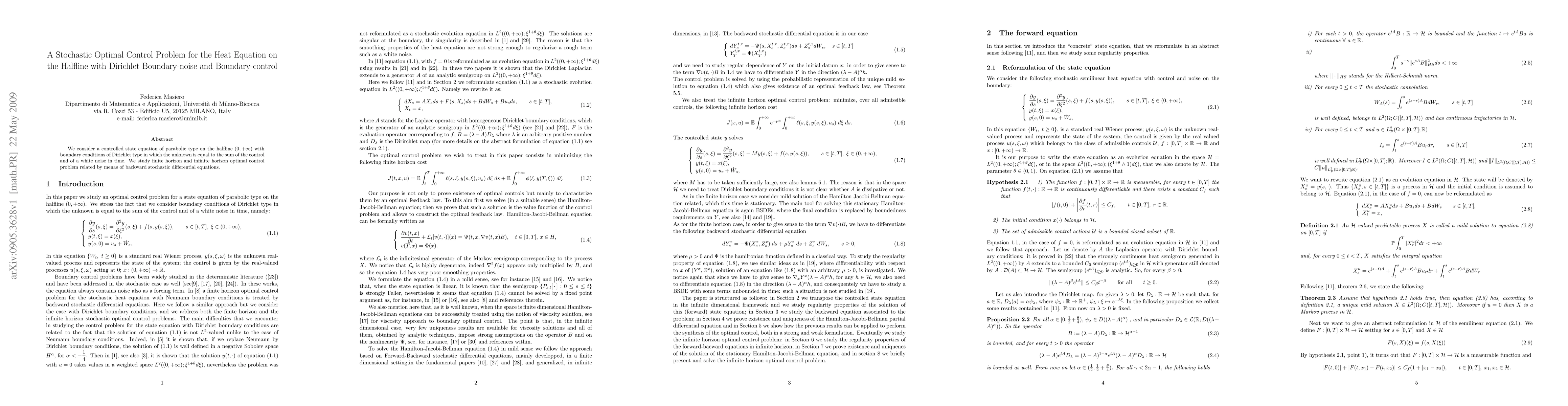 This paper investigates optimal control for a parabolic heat equation on the halfline with Dirichlet boundary conditions, where the control and white noise affect the boundary. The study focuses on both finite and infinite horizon optimal control problems using backward stochastic differential equations.