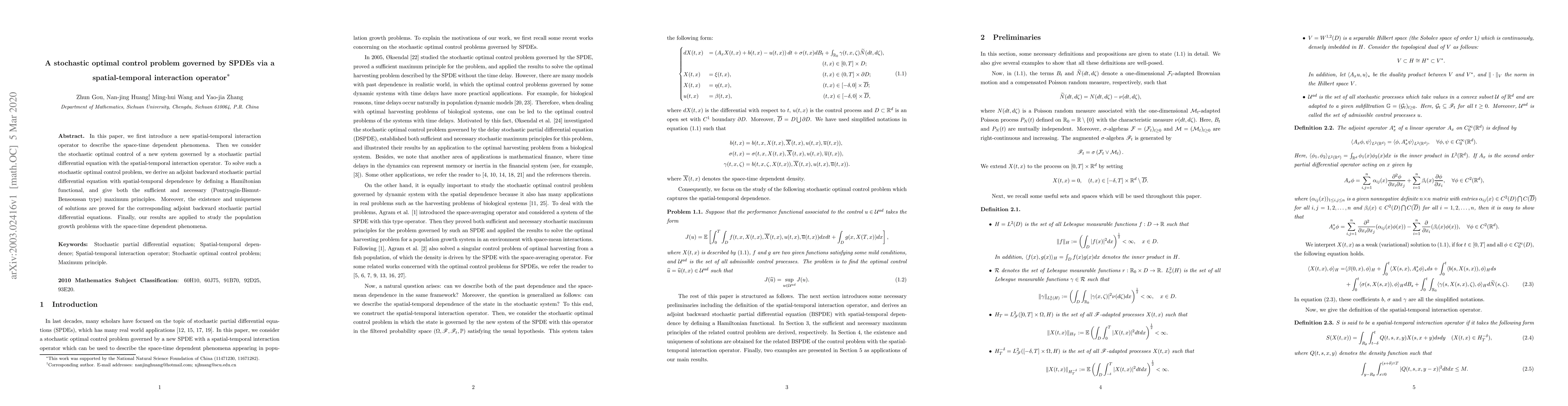 This paper introduces a spatial-temporal interaction operator to model space-time dependent phenomena and addresses stochastic optimal control for a system governed by stochastic partial differential equations. It derives an adjoint backward stochastic partial differential equation and proves existence and uniqueness, applying the results to population growth problems.