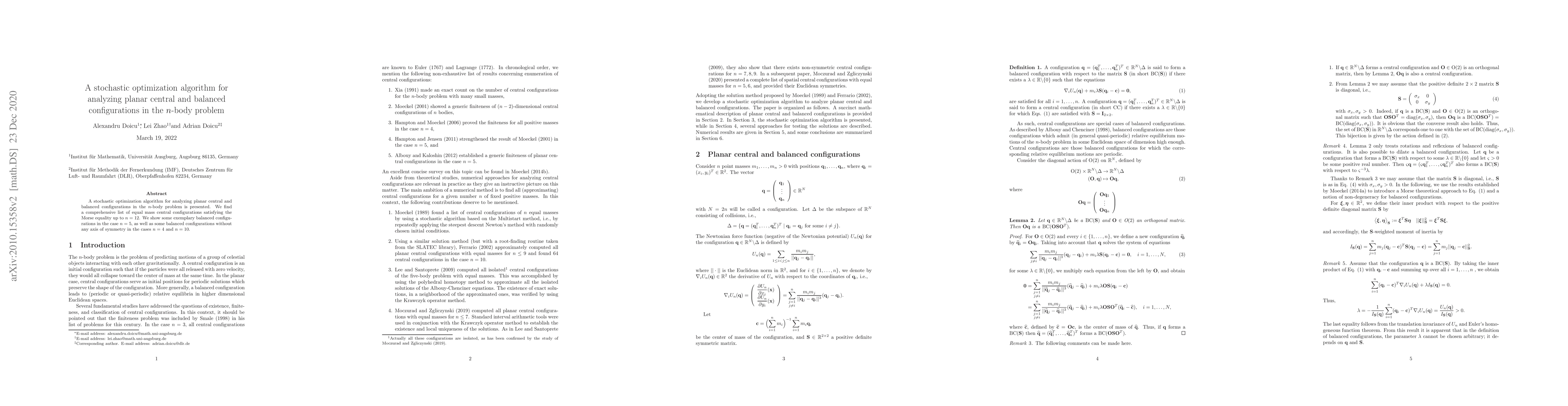 A stochastic optimization algorithm for analyzing planar central and balanced configurations in the $n$-body problem is presented. We find a comprehensive list of equal mass central configurations satisfying the Morse equality up to $n=12$. We show some exemplary balanced configurations in the case $n=5$, as well as some balanced configurations without any axis of symmetry in the cases $n=4$ and $n=10$.
