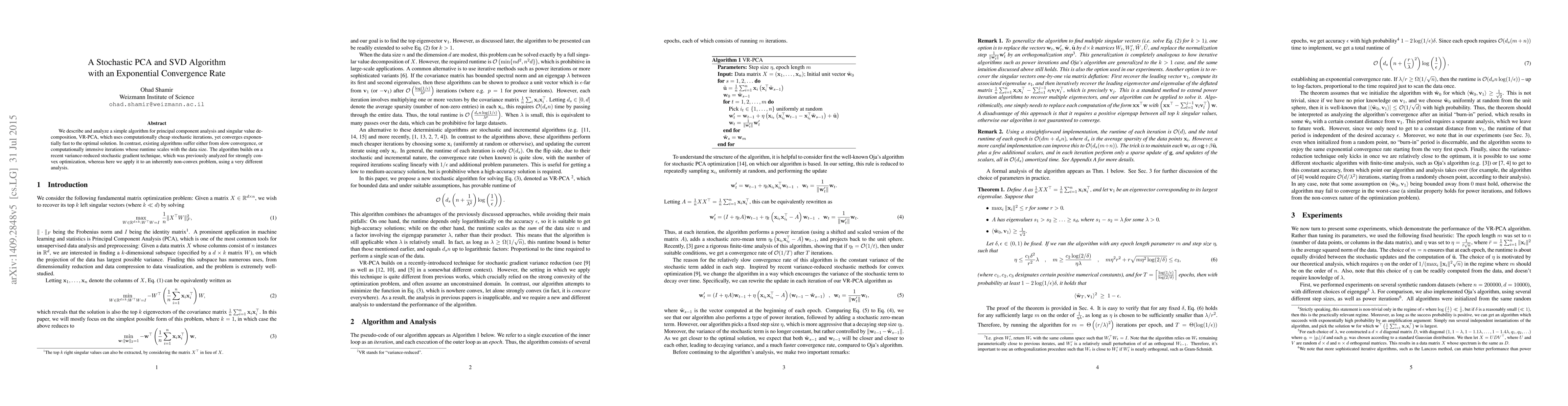 This paper introduces VR-PCA, a novel algorithm for principal component analysis and singular value decomposition that leverages stochastic iterations for fast exponential convergence. Unlike existing methods, VR-PCA avoids slow convergence or high computational costs, offering a significant improvement in efficiency.
