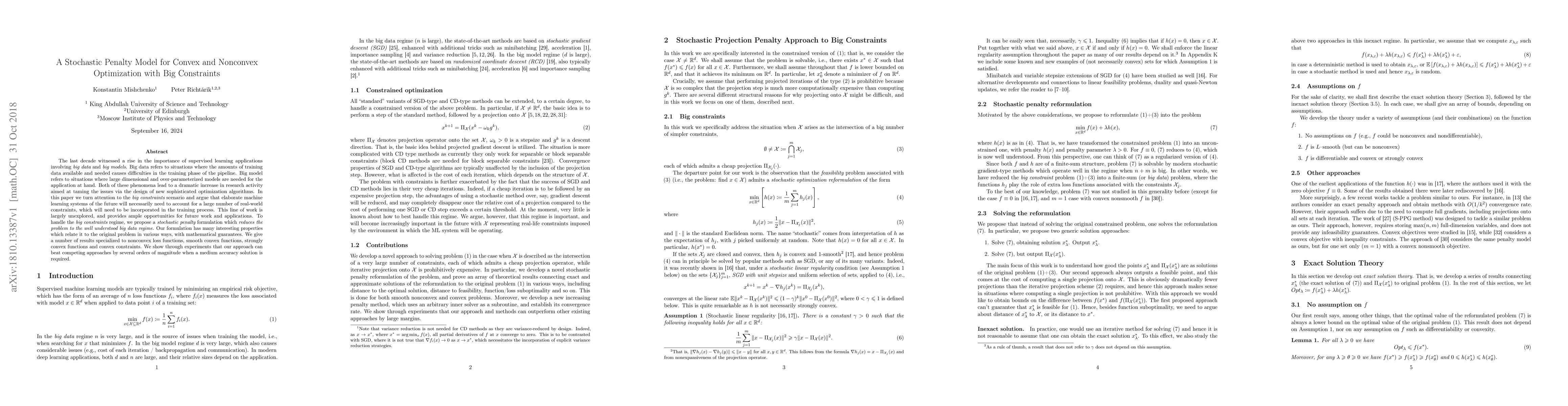 The last decade witnessed a rise in the importance of supervised learning applications involving {\em big data} and {\em big models}. Big data refers to situations where the amounts of training data available and needed causes difficulties in the training phase of the pipeline. Big model refers to situations where large dimensional and over-parameterized models are needed for the application at hand. Both of these phenomena lead to a dramatic increase in research activity aimed at taming the issues via the design of new sophisticated optimization algorithms. In this paper we turn attention to the {\em big constraints} scenario and argue that elaborate machine learning systems of the future will necessarily need to account for a large number of real-world constraints, which will need to be incorporated in the training process. This line of work is largely unexplored, and provides ample opportunities for future work and applications. To handle the {\em big constraints} regime, we propose a {\em stochastic penalty} formulation which {\em reduces the problem to the well understood big data regime}. Our formulation has many interesting properties which relate it to the original problem in various ways, with mathematical guarantees. We give a number of results specialized to nonconvex loss functions, smooth convex functions, strongly convex functions and convex constraints. We show through experiments that our approach can beat competing approaches by several orders of magnitude when a medium accuracy solution is required.
