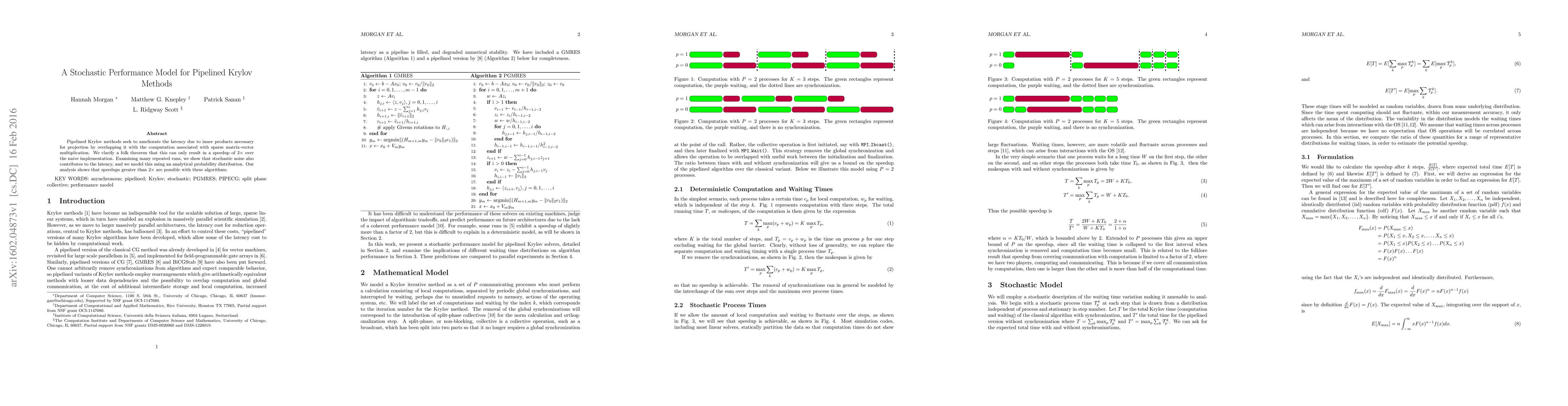 Pipelined Krylov methods seek to ameliorate the latency due to inner products necessary for projection by overlapping it with the computation associated with sparse matrix-vector multiplication. We clarify a folk theorem that this can only result in a speedup of $2\times$ over the naive implementation. Examining many repeated runs, we show that stochastic noise also contributes to the latency, and we model this using an analytical probability distribution. Our analysis shows that speedups greater than $2\times$ are possible with these algorithms.
