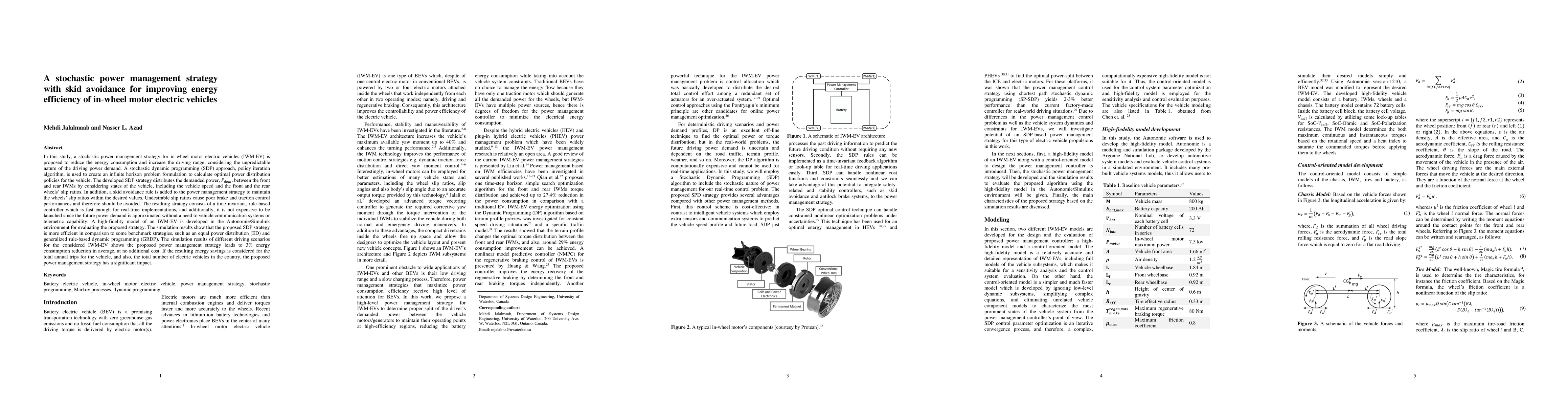 This study proposes a stochastic power management strategy using stochastic dynamic programming for in-wheel motor electric vehicles to optimize energy efficiency and driving range by distributing power between the front and rear motors based on vehicle states and skid avoidance rules. Simulation results show significant energy savings compared to benchmark strategies.