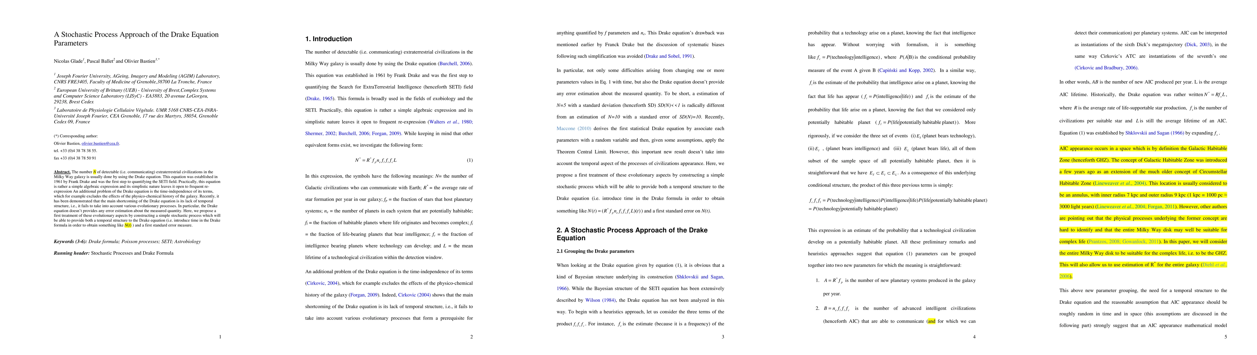 This paper proposes a stochastic process approach to address the limitations of the Drake equation, introducing a temporal structure and providing a standard error measure to account for evolutionary processes and the physico-chemical history of the galaxy.