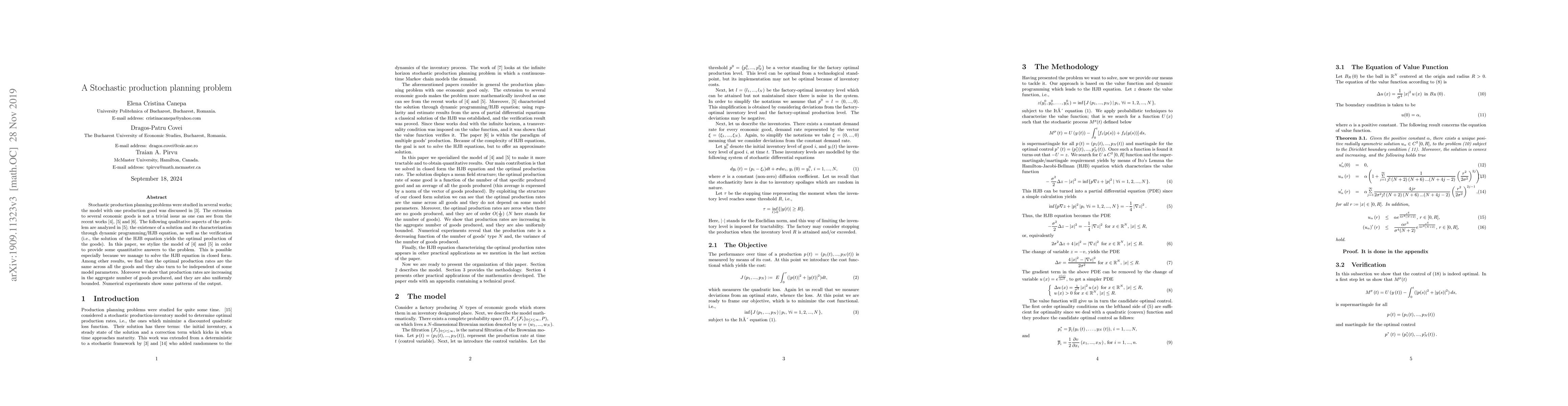 This research paper solves a stochastic production planning problem for multiple goods, finding that optimal production rates are constant across goods and independent of some parameters, increasing with aggregate output but uniformly bounded.