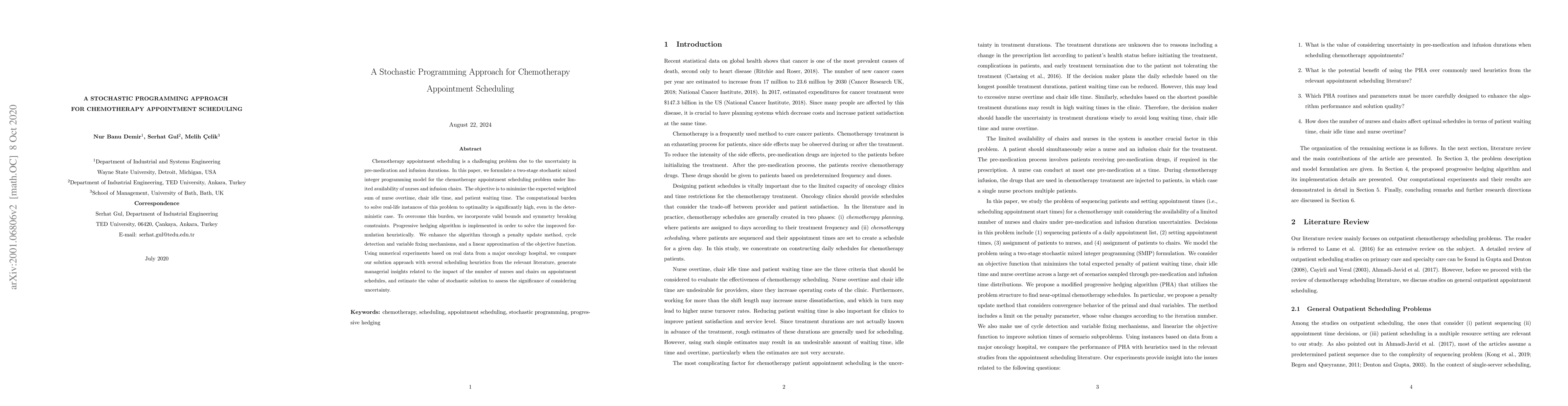 This paper proposes a stochastic programming model to optimize chemotherapy appointment scheduling, aiming to minimize nurse overtime, chair idle time, and patient waiting time under resource constraints. It employs a progressive hedging algorithm enhanced with various mechanisms to solve the problem heuristically, demonstrating its effectiveness through real-world data comparisons and managerial insights.