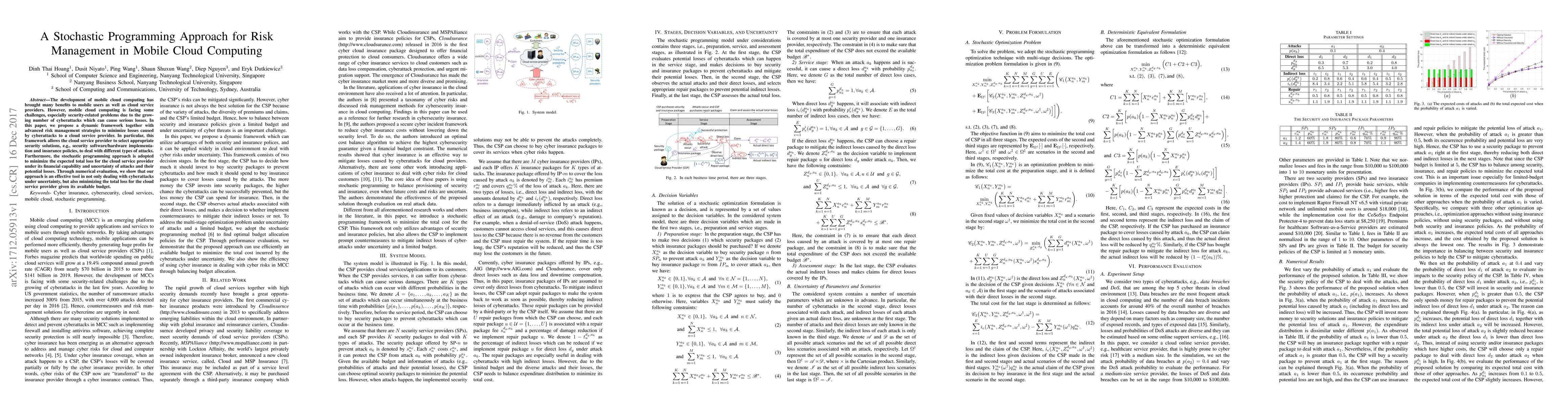 This paper proposes a stochastic programming framework for risk management in mobile cloud computing, aiming to minimize cyberattack losses for cloud service providers. The framework selects optimal security solutions and insurance policies, demonstrating effectiveness through numerical evaluation.