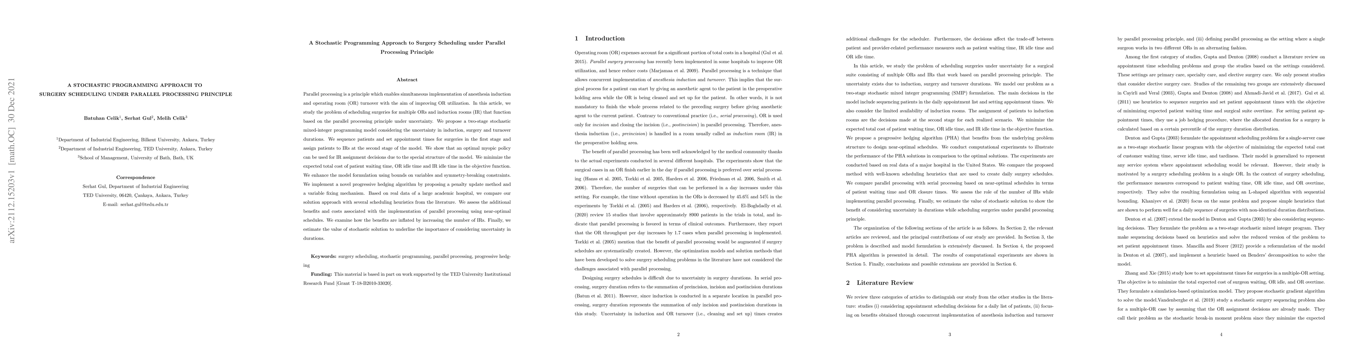 This study proposes a stochastic programming approach to optimize surgery scheduling in hospitals with parallel processing, aiming to minimize patient waiting time and OR idle time while considering uncertainty in procedure durations.