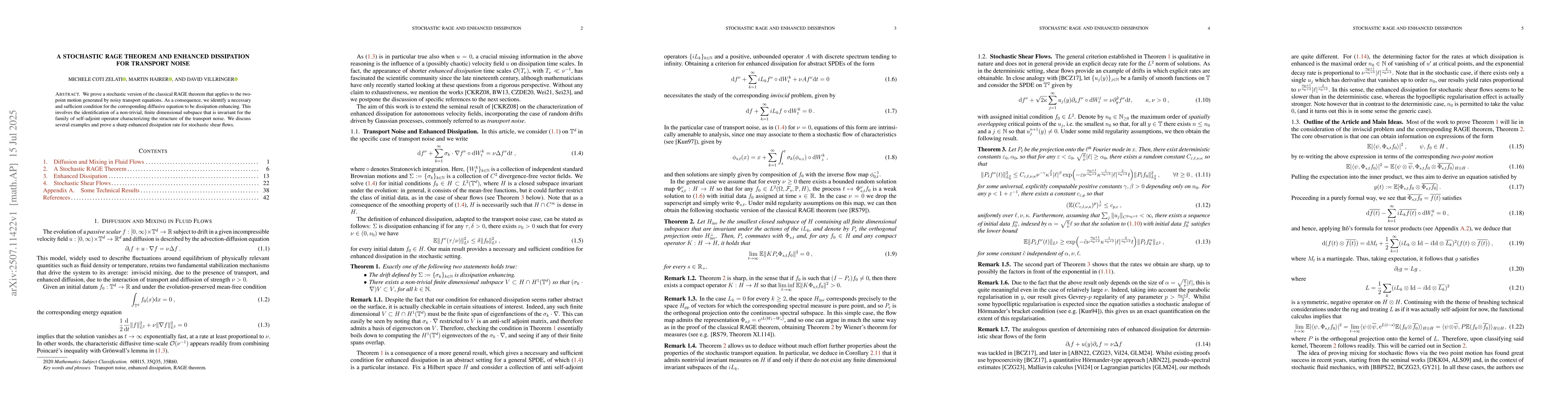 We prove a stochastic version of the classical RAGE theorem that applies to the two-point motion generated by noisy transport equations. As a consequence, we identify a necessary and sufficient condition for the corresponding diffusive equation to be dissipation enhancing. This involves the identification of a non-trivial, finite dimensional subspace that is invariant for the family of self-adjoint operator characterizing the structure of the transport noise. We discuss several examples and prove a sharp enhanced dissipation rate for stochastic shear flows.