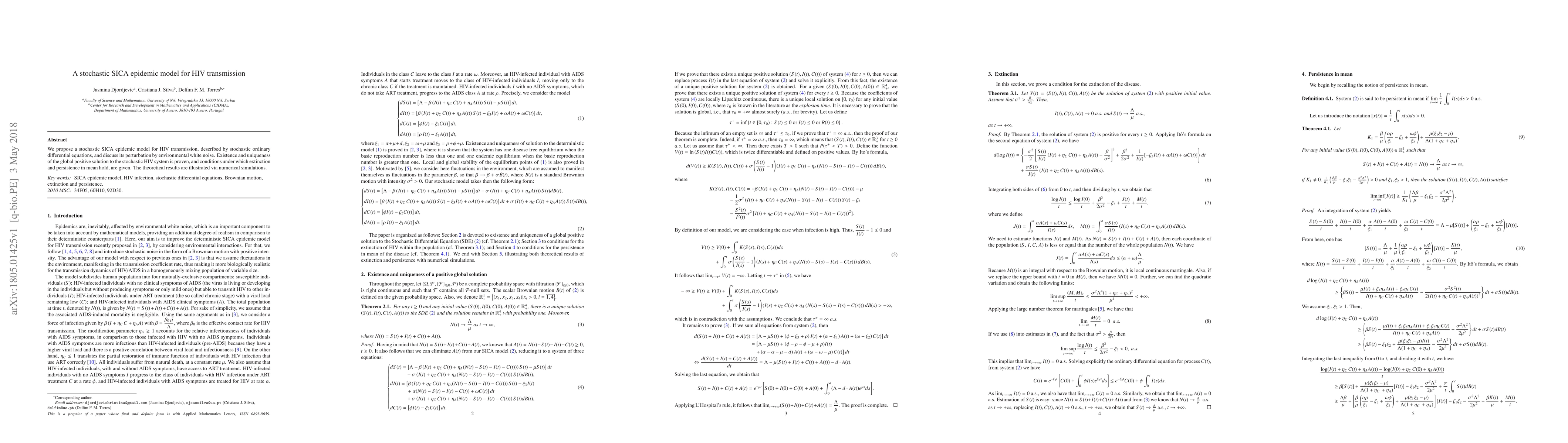 We propose a stochastic SICA epidemic model for HIV transmission, described by stochastic ordinary differential equations, and discuss its perturbation by environmental white noise. Existence and uniqueness of the global positive solution to the stochastic HIV system is proven, and conditions under which extinction and persistence in mean hold, are given. The theoretical results are illustrated via numerical simulations.