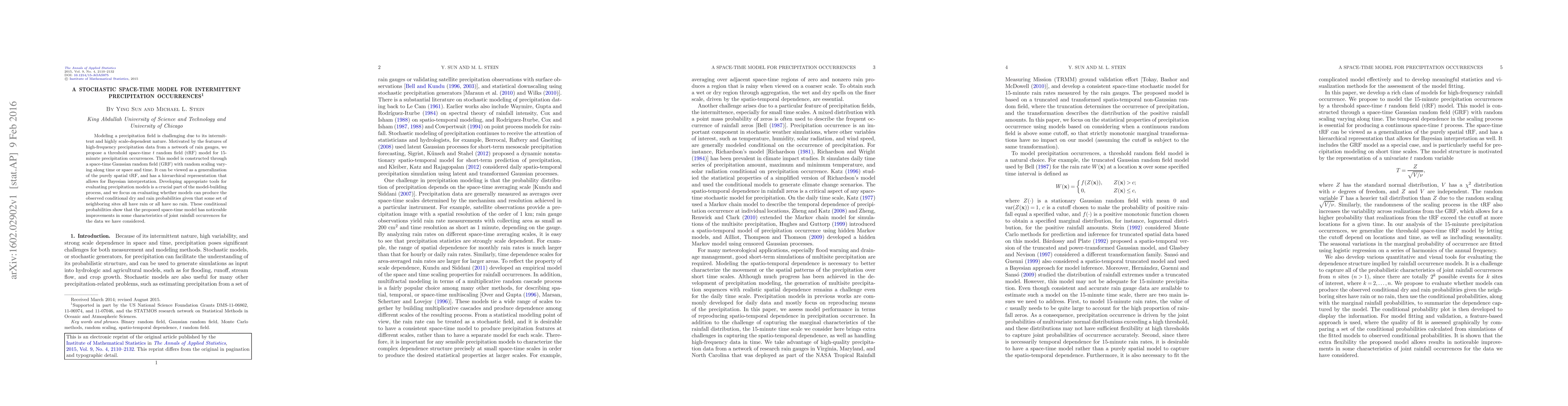 Modeling a precipitation field is challenging due to its intermittent and highly scale-dependent nature. Motivated by the features of high-frequency precipitation data from a network of rain gauges, we propose a threshold space-time $t$ random field (tRF) model for 15-minute precipitation occurrences. This model is constructed through a space-time Gaussian random field (GRF) with random scaling varying along time or space and time. It can be viewed as a generalization of the purely spatial tRF, and has a hierarchical representation that allows for Bayesian interpretation. Developing appropriate tools for evaluating precipitation models is a crucial part of the model-building process, and we focus on evaluating whether models can produce the observed conditional dry and rain probabilities given that some set of neighboring sites all have rain or all have no rain. These conditional probabilities show that the proposed space-time model has noticeable improvements in some characteristics of joint rainfall occurrences for the data we have considered.