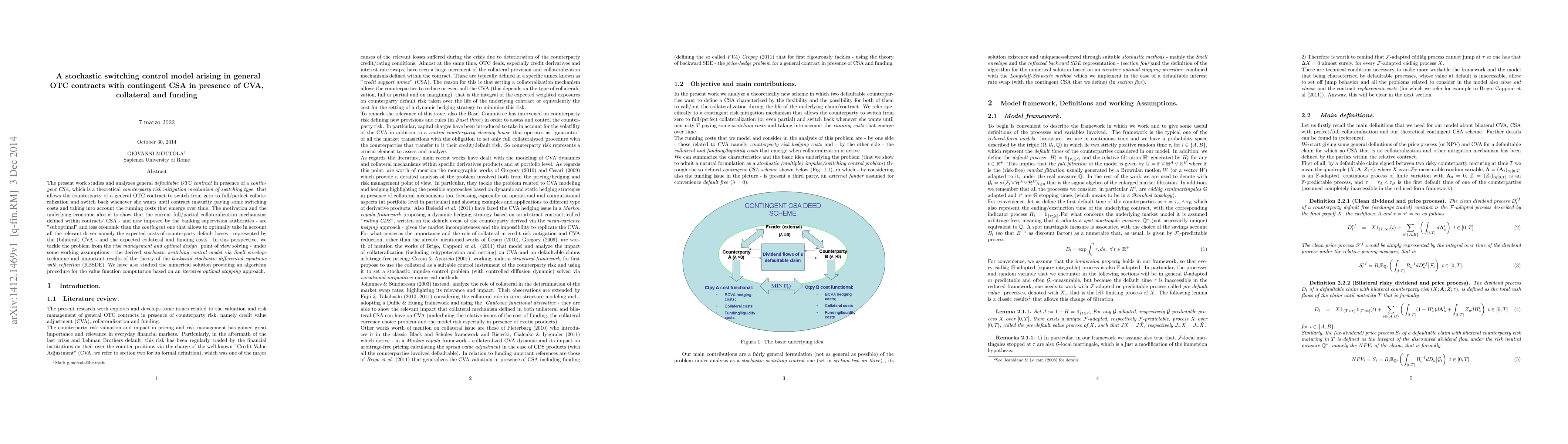 The present work studies and analyzes general defaultable OTC contract in presence of a contingent CSA, which is a theoretical counterparty risk mitigation mechanism of switching type that allows the counterparty of a general OTC contract to switch from zero to full/perfect collateralization and switch back whenever she wants until contract maturity paying some switching costs and taking into account the running costs that emerge over time. The motivation and the underlying economic idea is to show that the current full/partial collateralization mechanisms defined within contracts' CSA - and now imposed by the banking supervision authorities - are "suboptimal" and less economic than the contingent one that allows to optimally take in account all the relevant driver namely the expected costs of counterparty default losses - represented by the (bilateral) CVA - and the expected collateral and funding costs. In this perspective, we tackle the problem from the risk management and optimal design point of view solving - under some working assumptions - the derived stochastic switching control model via Snell envelope technique and important results of the theory of the backward stochastic differential equations with reflection (RBSDE). We have also studied the numerical solution providing an algorithm procedure for the value function computation based on an iterative optimal stopping approach.