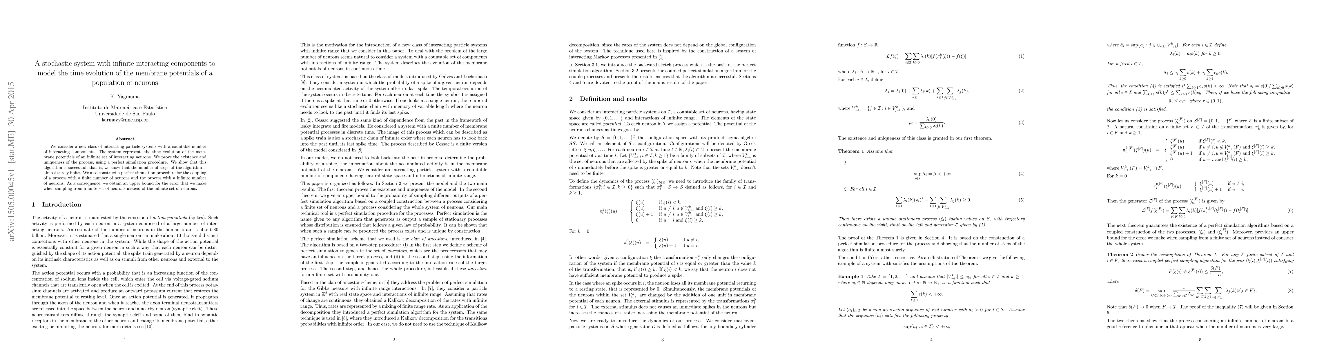 We consider a new class of interacting particle systems with a countable number of interacting components. The system represents the time evolution of the membrane potentials of an infinite set of interacting neurons. We prove the existence and uniqueness of the process, using a perfect simulation procedure. We show that this algorithm is successful, that is, we show that the number of steps of the algorithm is almost surely finite. We also construct a perfect simulation procedure for the coupling of a process with a finite number of neurons and the process with a infinite number of neurons. As a consequence, we obtain an upper bound for the error that we make when sampling from a finite set of neurons instead of the infinite set of neurons.