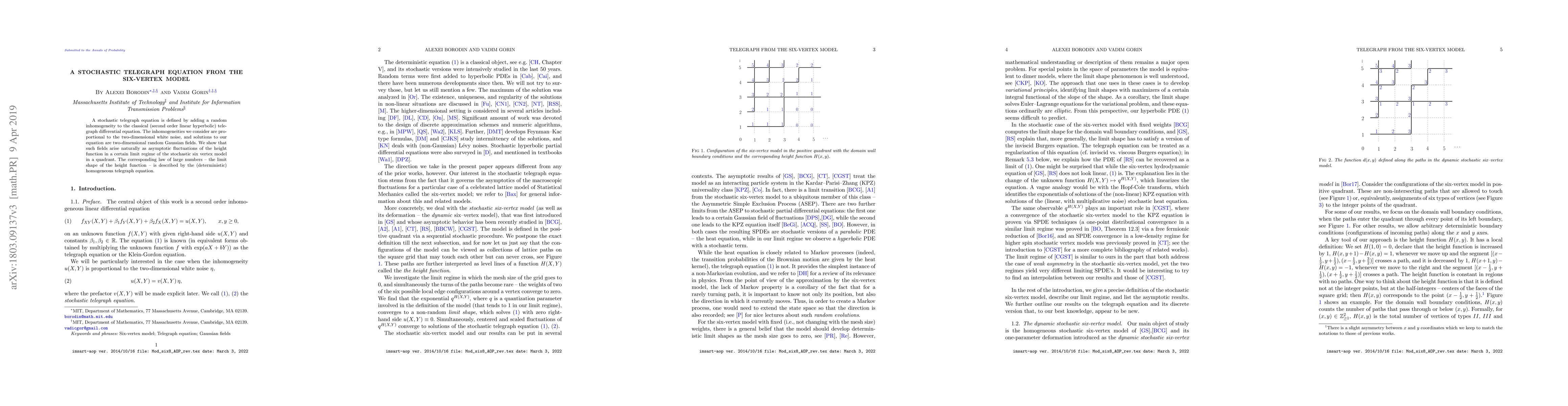 This paper derives a stochastic telegraph equation from the six-vertex model, showing that its solutions correspond to Gaussian fields arising from the asymptotic fluctuations of the height function in a specific limit regime of the model. The limit shape of the height function is governed by the deterministic homogeneous telegraph equation.