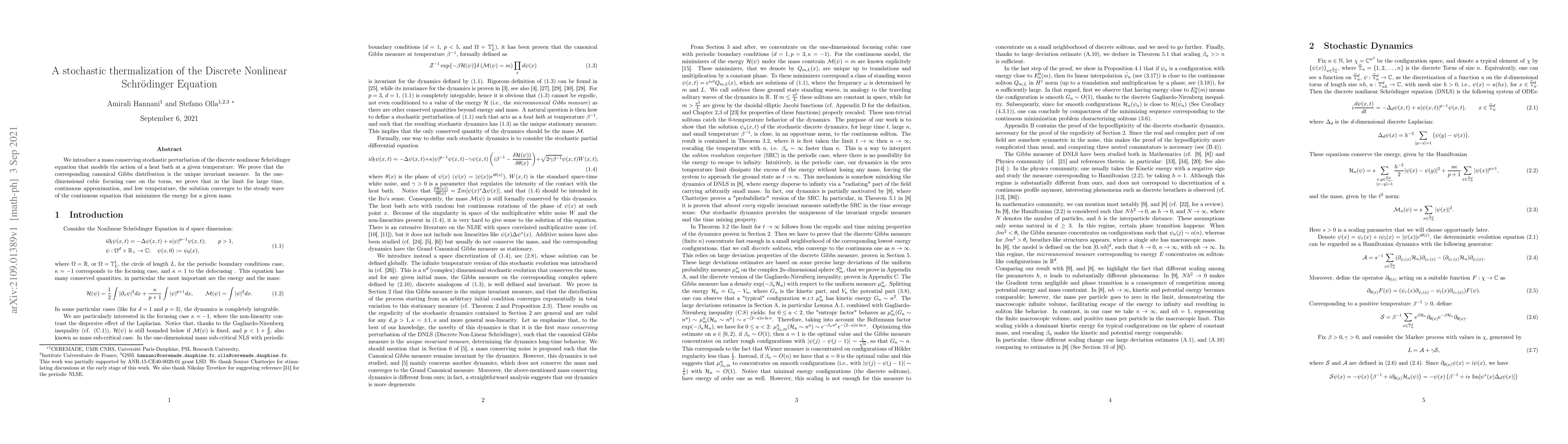 We introduce a mass conserving stochastic perturbation of the discrete nonlinear Schr\"odinger equation that models the action of a heat bath at a given temperature. We prove that the corresponding canonical Gibbs distribution is the unique invariant measure. In the one-dimensional cubic focusing case on the torus, we prove that in the limit for large time, continuous approximation, and low temperature, the solution converges to the steady wave of the continuous equation that minimizes the energy for a given mass.