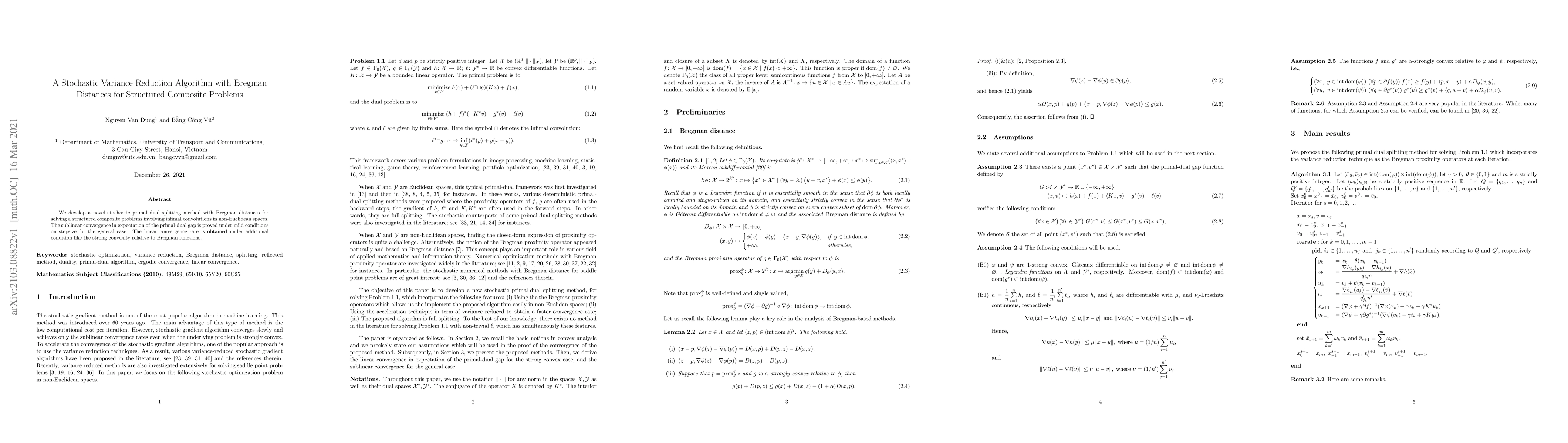 This paper introduces a new stochastic primal-dual algorithm using Bregman distances for structured composite problems, proving sublinear convergence in expectation and linear convergence under strong convexity conditions.