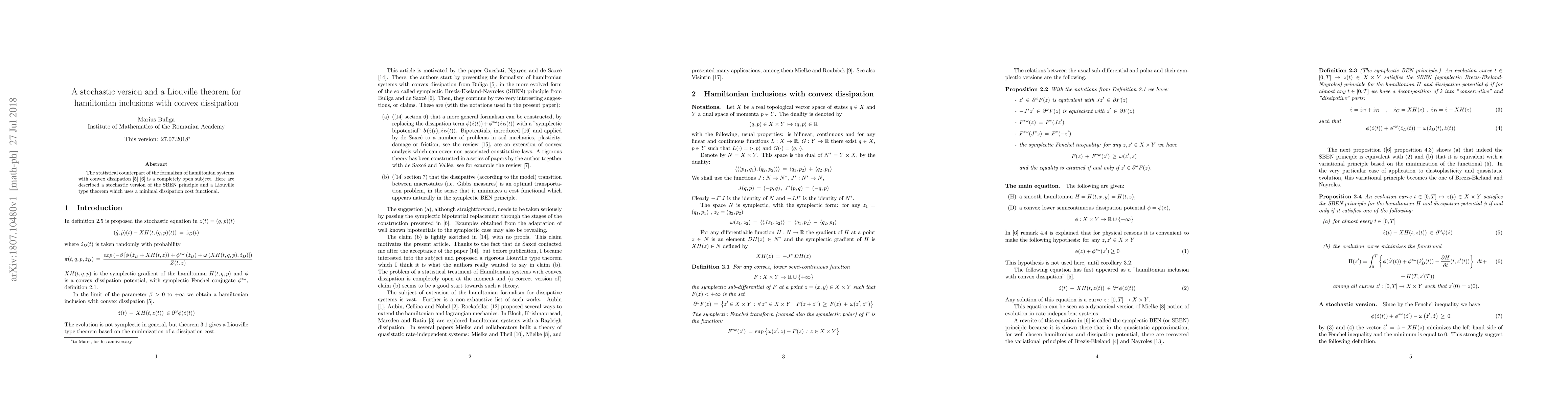 The statistical counterpart of the formalism of hamiltonian systems with convex dissipation arXiv:0810.1419 , arXiv:1408.3102 is a completely open subject. Here are described a stochastic version of the SBEN principle and a Liouville type theorem which uses a minimal dissipation cost functional.