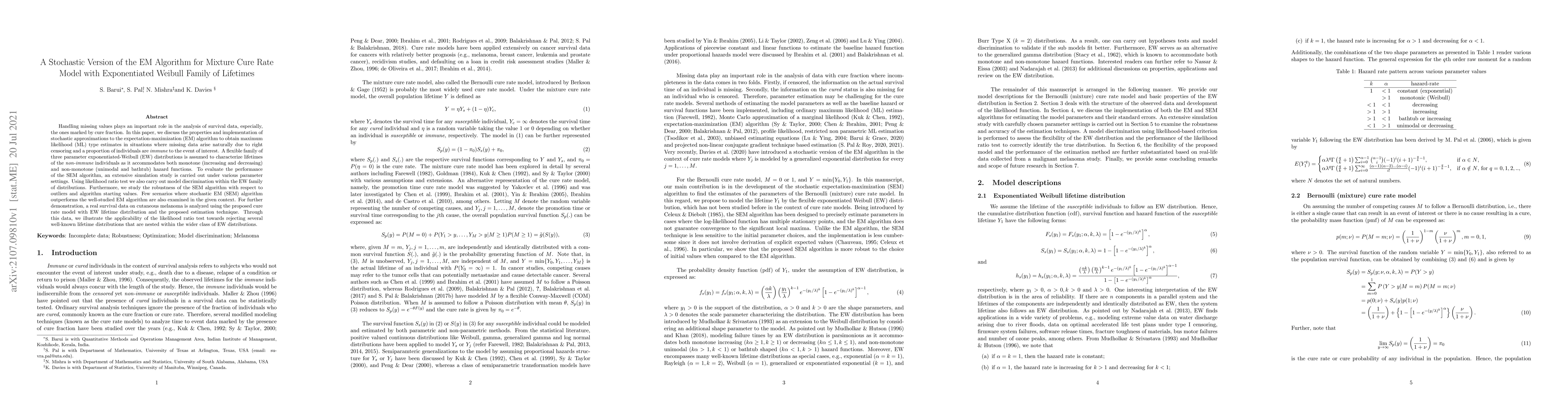 Handling missing values plays an important role in the analysis of survival data, especially, the ones marked by cure fraction. In this paper, we discuss the properties and implementation of stochastic approximations to the expectation-maximization (EM) algorithm to obtain maximum likelihood (ML) type estimates in situations where missing data arise naturally due to right censoring and a proportion of individuals are immune to the event of interest. A flexible family of three parameter exponentiated-Weibull (EW) distributions is assumed to characterize lifetimes of the non-immune individuals as it accommodates both monotone (increasing and decreasing) and non-monotone (unimodal and bathtub) hazard functions. To evaluate the performance of the SEM algorithm, an extensive simulation study is carried out under various parameter settings. Using likelihood ratio test we also carry out model discrimination within the EW family of distributions. Furthermore, we study the robustness of the SEM algorithm with respect to outliers and algorithm starting values. Few scenarios where stochastic EM (SEM) algorithm outperforms the well-studied EM algorithm are also examined in the given context. For further demonstration, a real survival data on cutaneous melanoma is analyzed using the proposed cure rate model with EW lifetime distribution and the proposed estimation technique. Through this data, we illustrate the applicability of the likelihood ratio test towards rejecting several well-known lifetime distributions that are nested within the wider class of EW distributions.