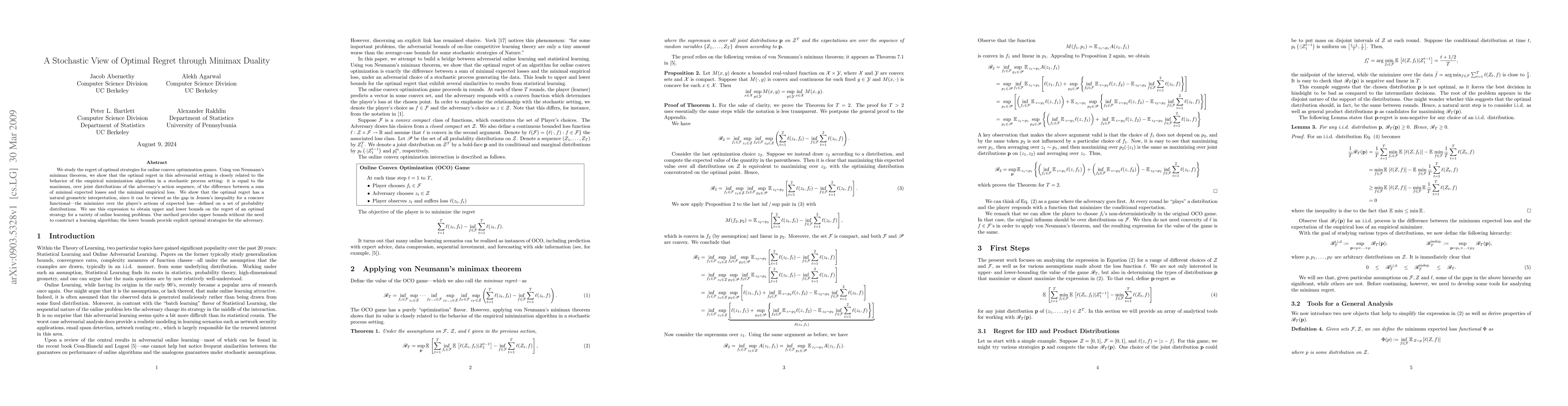 We study the regret of optimal strategies for online convex optimization games. Using von Neumann's minimax theorem, we show that the optimal regret in this adversarial setting is closely related to the behavior of the empirical minimization algorithm in a stochastic process setting: it is equal to the maximum, over joint distributions of the adversary's action sequence, of the difference between a sum of minimal expected losses and the minimal empirical loss. We show that the optimal regret has a natural geometric interpretation, since it can be viewed as the gap in Jensen's inequality for a concave functional--the minimizer over the player's actions of expected loss--defined on a set of probability distributions. We use this expression to obtain upper and lower bounds on the regret of an optimal strategy for a variety of online learning problems. Our method provides upper bounds without the need to construct a learning algorithm; the lower bounds provide explicit optimal strategies for the adversary.