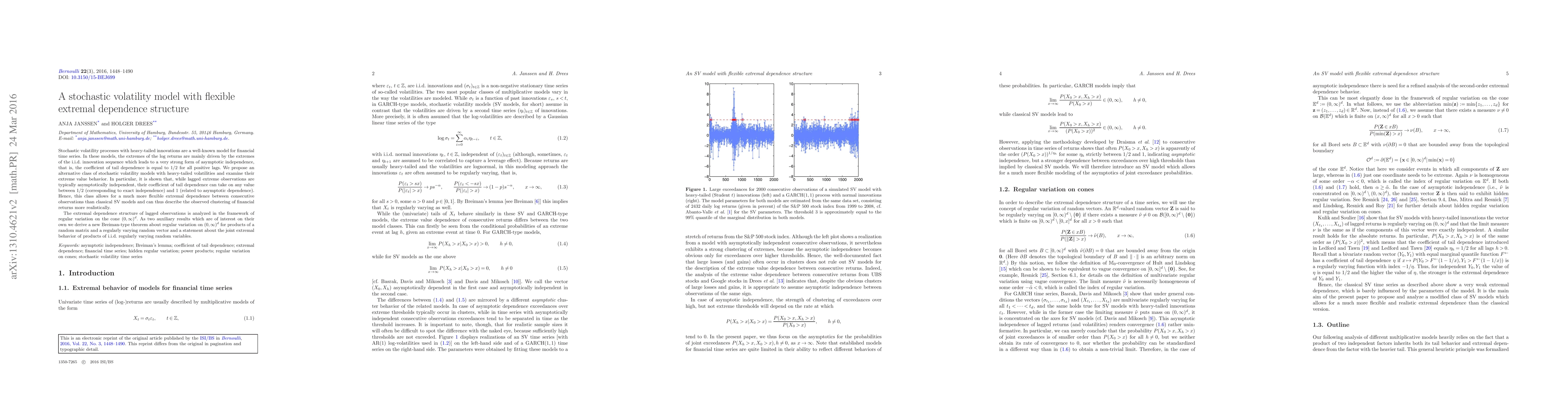 The paper proposes a new stochastic volatility model for financial time series that allows for flexible extremal dependence between observations, offering a more realistic description of financial return clustering compared to classical models. The model can accommodate a range of tail dependence coefficients between observations, from exact independence to strong dependence.