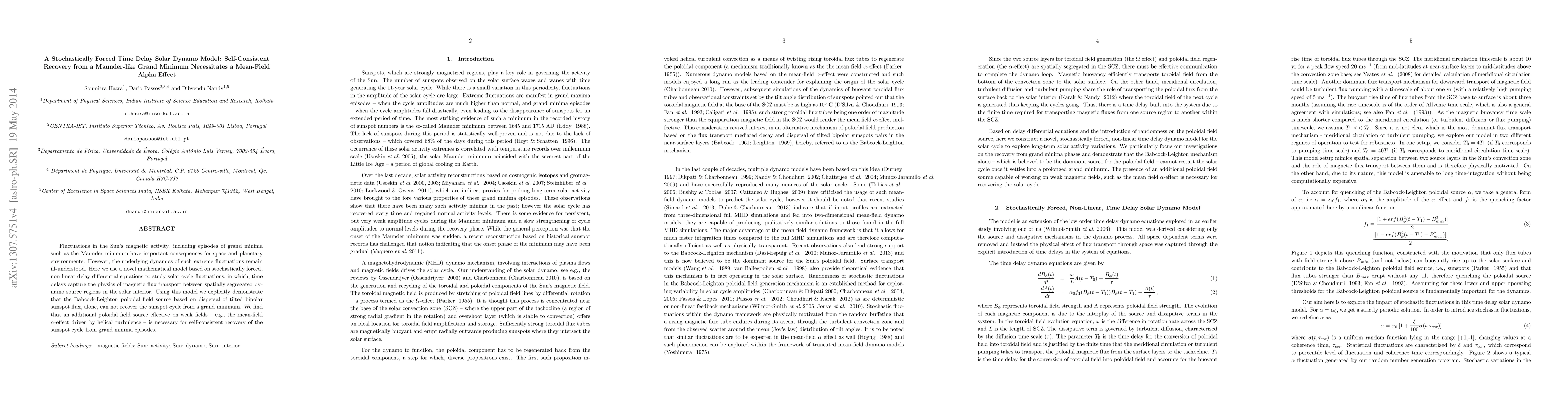 This paper introduces a stochastically forced time delay model to study solar cycle fluctuations, revealing that the Babcock-Leighton mechanism alone cannot recover from grand minima, necessitating the mean-field alpha effect for self-consistent recovery.