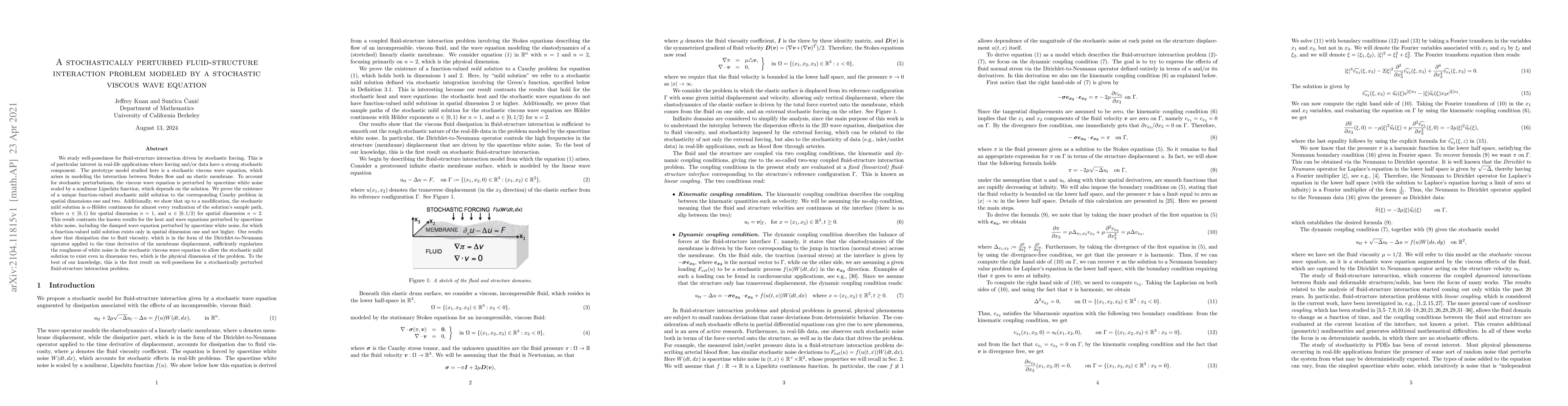 We study well-posedness for fluid-structure interaction driven by stochastic forcing. This is of particular interest in real-life applications where forcing and/or data have a strong stochastic component. The prototype model studied here is a stochastic viscous wave equation, which arises in modeling the interaction between Stokes flow and an elastic membrane. To account for stochastic perturbations, the viscous wave equation is perturbed by spacetime white noise scaled by a nonlinear Lipschitz function, which depends on the solution. We prove the existence of a unique function-valued stochastic mild solution to the corresponding Cauchy problem in spatial dimensions one and two. Additionally, we show that up to a modification, the stochastic mild solution is $\alpha$-H\"{o}lder continuous for almost every realization of the solution's sample path, where $\alpha\in[0,1)$ for spatial dimension $n=1$, and $\alpha \in [0,1/2)$ for spatial dimension $n=2$. This result contrasts the known results for the heat and wave equations perturbed by spacetime white noise, including the damped wave equation perturbed by spacetime white noise, for which a function-valued mild solution exists only in spatial dimension one and not higher. Our results show that dissipation due to fluid viscosity, which is in the form of the Dirichlet-to-Neumann operator applied to the time derivative of the membrane displacement, sufficiently regularizes the roughness of white noise in the stochastic viscous wave equation to allow the stochastic mild solution to exist even in dimension two, which is the physical dimension of the problem. To the best of our knowledge, this is the first result on well-posedness for a stochastically perturbed fluid-structure interaction problem.