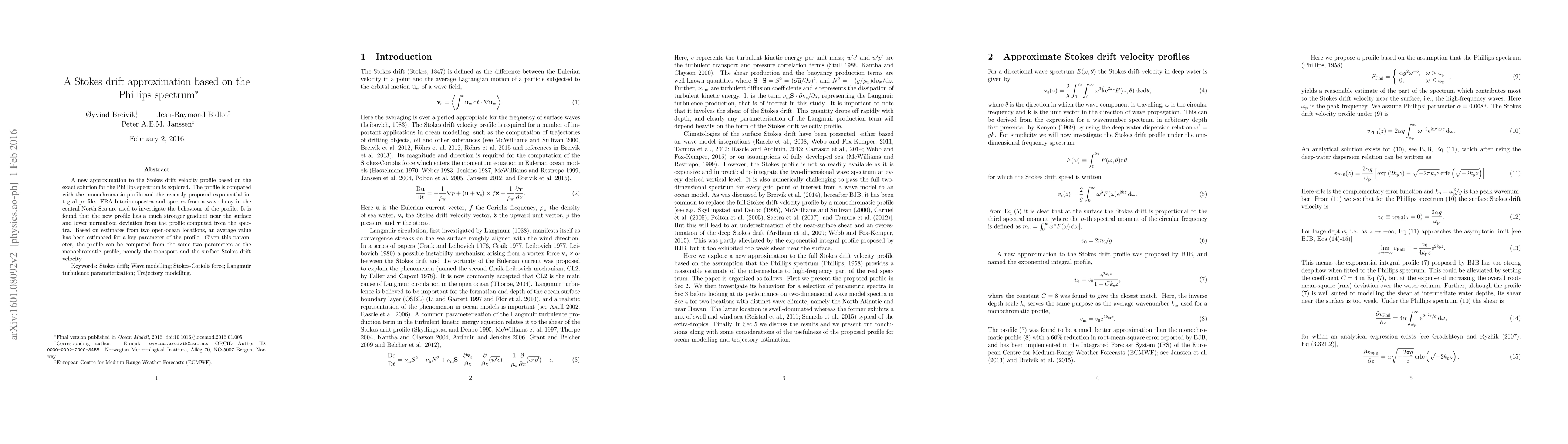 This paper introduces a new approximation for the Stokes drift velocity profile based on the Phillips spectrum, showing it has a stronger gradient near the surface and lower deviation compared to existing profiles. The new profile requires the same two parameters as the monochromatic profile: transport and surface Stokes drift velocity.
