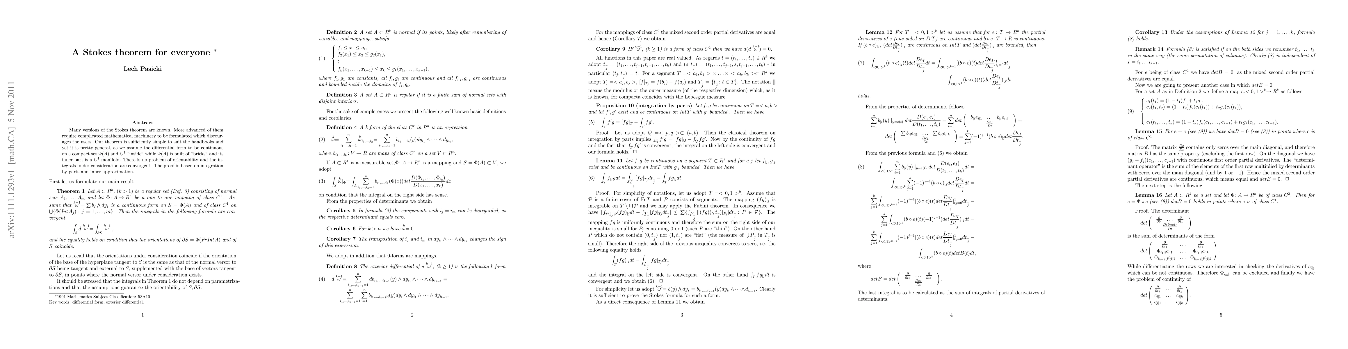 Many versions of the Stokes theorem are known. More advanced of them require complicated mathematical machinery to be formulated which discourages the users. Our theorem is sufficiently simple to suit the handbooks and yet it is pretty general, as we assume the differential form to be continuous on a compact set F(A) and C1 "inside" while F(A) is built of "bricks" and its inner part is a C1 manifold. There is no problem of orientability and the integrals under consideration are convergent. The proof is based on integration by parts and inner approximation.