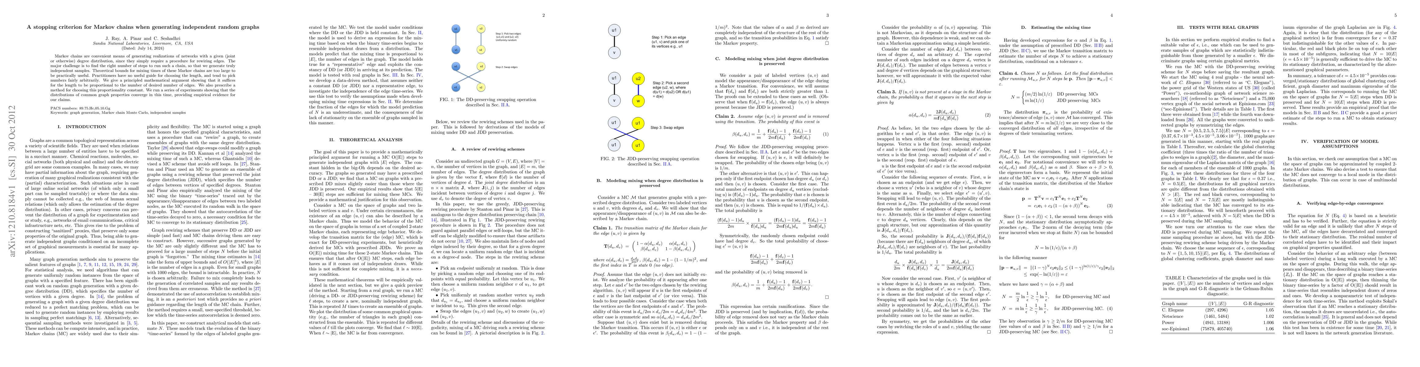This paper proposes a mathematical criterion for determining the optimal stopping time for Markov chains used to generate independent random graphs, suggesting that the chain should run proportionally to the number of edges. Experimental results confirm that the proposed method leads to convergence in the distributions of common graph properties.