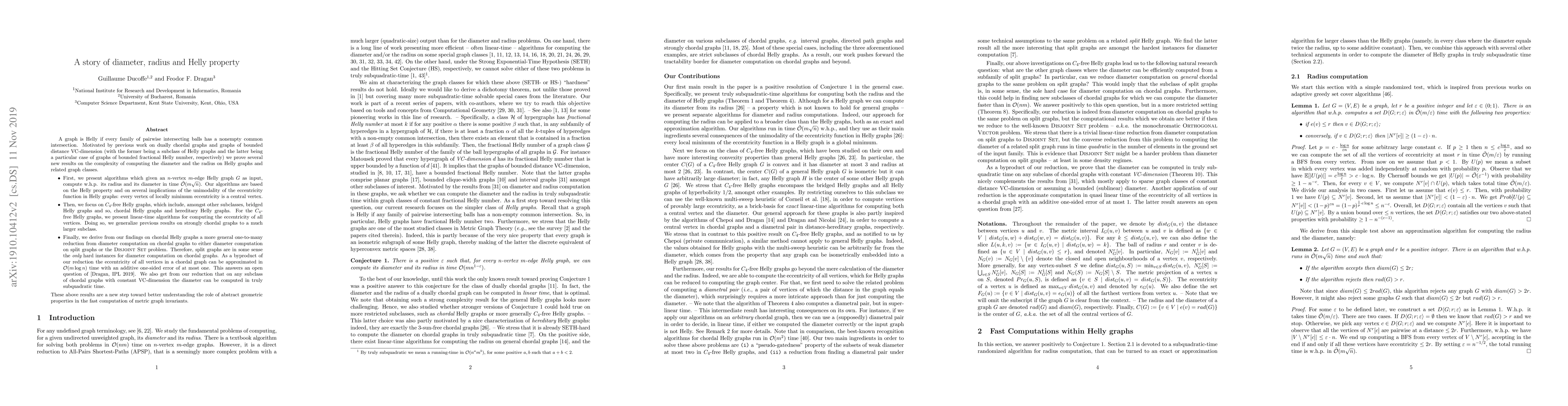 A graph is Helly if every family of pairwise intersecting balls has a nonempty common intersection. Motivated by previous work on dually chordal graphs and graphs of bounded distance VC-dimension we prove several new results on the complexity of computing the diameter and the radius on Helly graphs and related graph classes. * First, we present algorithms which given an $n$-vertex $m$-edge Helly graph $G$ as input, compute w.h.p. its radius and its diameter in time $\tilde{\cal O}(m\sqrt{n})$. Our algorithms are based on the Helly property and on several implications of the unimodality of the eccentricity function in Helly graphs: every vertex of locally minimum eccentricity is a central vertex. * Then, we focus on $C_4$-free Helly graphs, which include, amongst other subclasses, bridged Helly graphs and so, chordal Helly graphs and hereditary Helly graphs. For the $C_4$-free Helly graphs, we present linear-time algorithms for computing the eccentricity of all vertices. Doing so, we generalize previous results on strongly chordal graphs to a much larger subclass. * Finally, we derive from our findings on chordal Helly graphs a more general one-to-many reduction from diameter computation on chordal graphs to either diameter computation on split graphs or the {\sc Disjoint Set} problem. Therefore, split graphs are in some sense the {\em only} hard instances for diameter computation on chordal graphs. As a byproduct of our reduction the eccentricity of all vertices in a chordal graph can be approximated in ${\cal O}(m\log{n})$ time with an additive one-sided error of at most one, and on any subclass of chordal graphs with constant VC-dimension the diameter can be computed in truly subquadratic time. These above results are a new step toward better understanding the role of abstract geometric properties in the fast computation of metric graph invariants.
