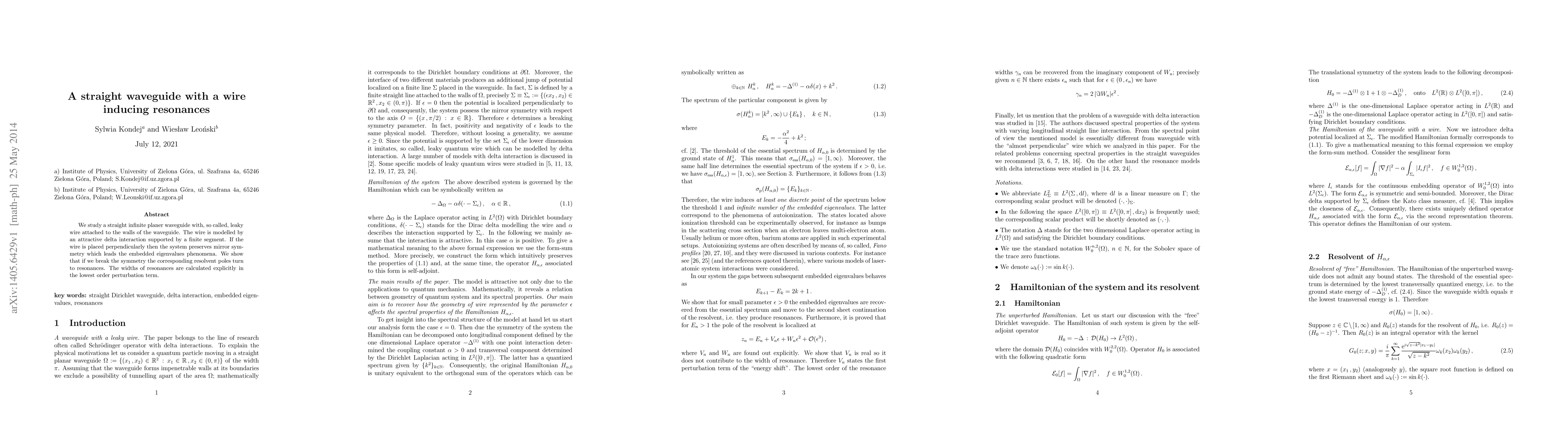 This paper investigates a straight infinite planar waveguide with a leaky wire attached perpendicularly, preserving mirror symmetry, which induces embedded eigenvalues. Breaking this symmetry transforms the resolvent poles into resonances.