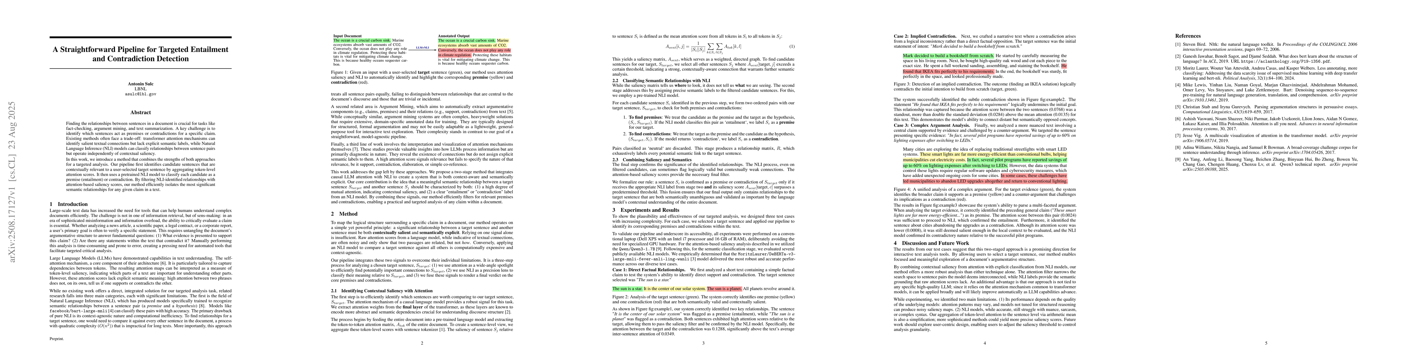 Finding the relationships between sentences in a document is crucial for tasks like fact-checking, argument mining, and text summarization. A key challenge is to identify which sentences act as premises or contradictions for a specific claim. Existing methods often face a trade-off: transformer attention mechanisms can identify salient textual connections but lack explicit semantic labels, while Natural Language Inference (NLI) models can classify relationships between sentence pairs but operate independently of contextual saliency. In this work, we introduce a method that combines the strengths of both approaches for a targeted analysis. Our pipeline first identifies candidate sentences that are contextually relevant to a user-selected target sentence by aggregating token-level attention scores. It then uses a pretrained NLI model to classify each candidate as a premise (entailment) or contradiction. By filtering NLI-identified relationships with attention-based saliency scores, our method efficiently isolates the most significant semantic relationships for any given claim in a text.