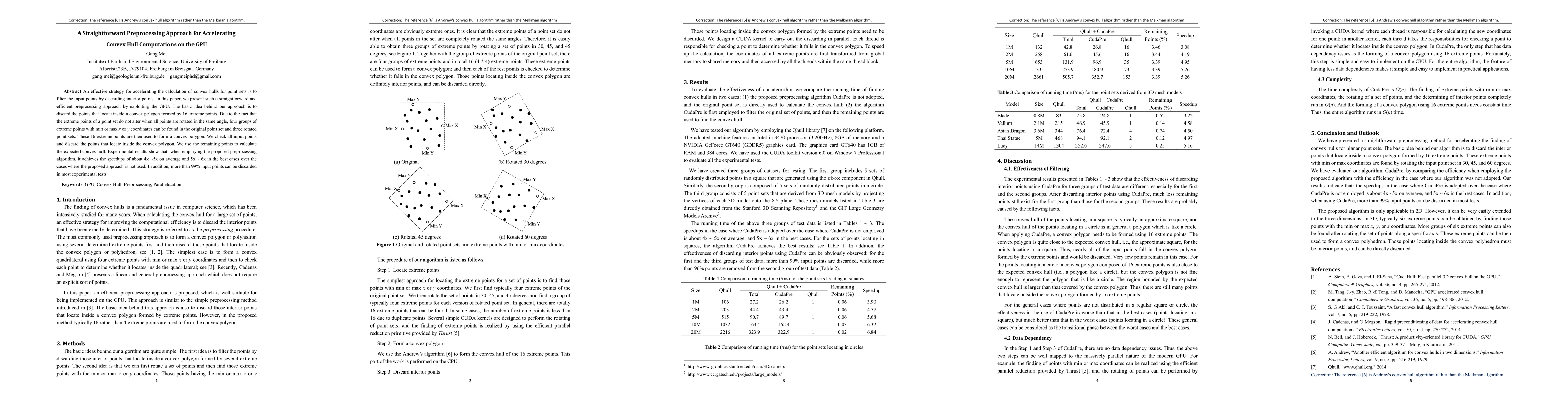 This paper proposes a GPU-based preprocessing method to accelerate convex hull computation by discarding interior points. The approach identifies 16 extreme points to form a convex polygon, filtering out most interior points, resulting in average speedups of 4x-5x and best-case speedups of 5x-6x.