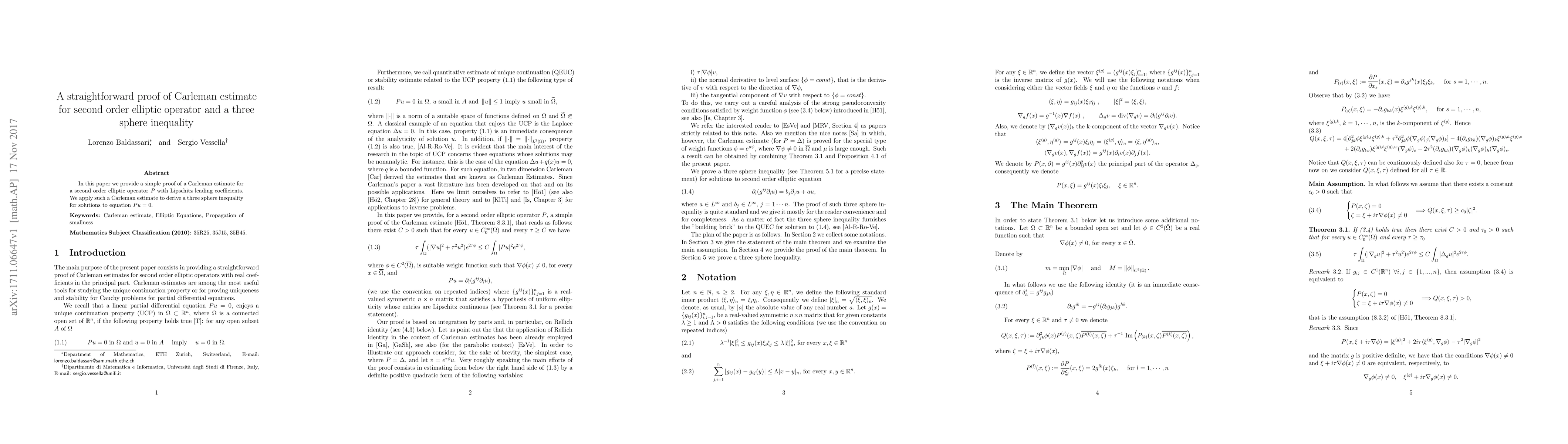 This paper offers a simplified proof of a Carleman estimate for second-order elliptic operators with Lipschitz coefficients, and uses this estimate to establish a three-sphere inequality for solutions to the equation Pu=0.