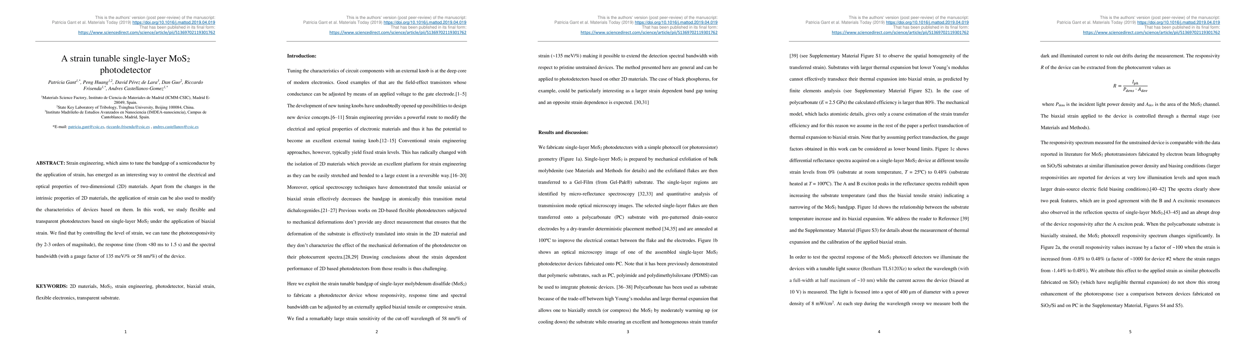 Strain engineering, which aims to tune the bandgap of a semiconductor by the application of strain, has emerged as an interesting way to control the electrical and optical properties of two-dimensional (2D) materials. Apart from the changes in the intrinsic properties of 2D materials, the application of strain can be also used to modify the characteristics of devices based on them. In this work, we study flexible and transparent photodetectors based on single-layer MoS2 under the application of biaxial strain. We find that by controlling the level of strain, we can tune the photoresponsivity (by 2-3 orders of magnitude), the response time (from <80 ms to 1.5 s) and the spectral bandwidth (with a gauge factor of 135 meV/% or 58 nm/%) of the device.