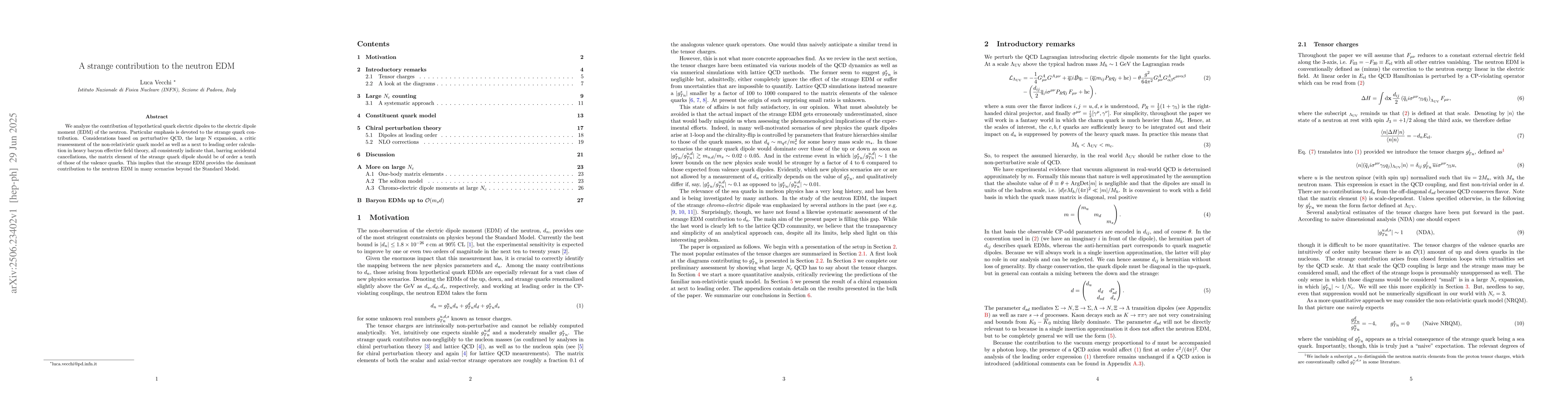We analyze the contribution of hypothetical quark electric dipoles to the electric dipole moment (EDM) of the neutron. Particular emphasis is devoted to the strange quark contribution. Considerations based on perturbative QCD, the large N expansion, a critic reassessment of the non-relativistic quark model as well as a next to leading order calculation in heavy baryon effective field theory, all consistently indicate that, barring accidental cancellations, the matrix element of the strange quark dipole should be of order a tenth of those of the valence quarks. This implies that the strange EDM provides the dominant contribution to the neutron EDM in many scenarios beyond the Standard Model.