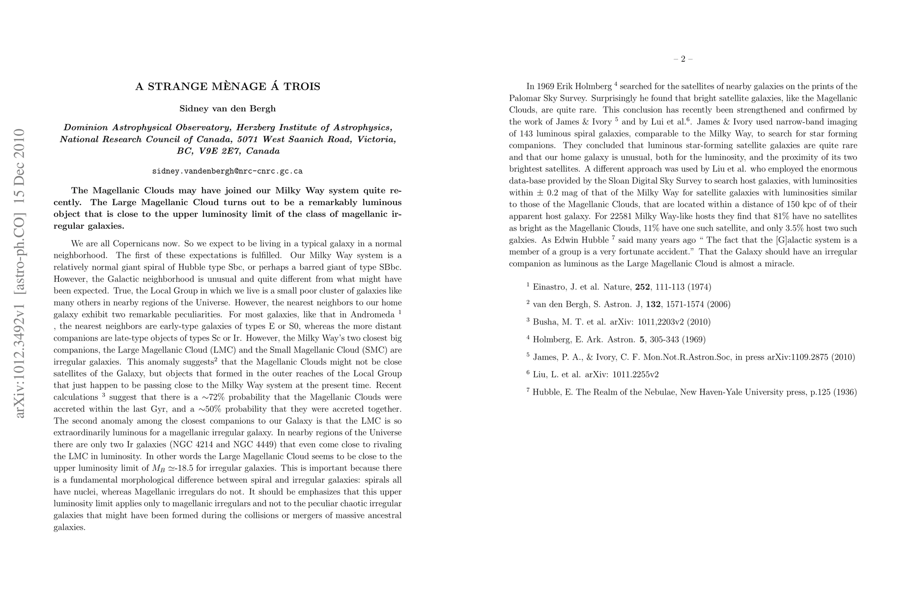 The Magellanic Clouds may have joined our Milky Way system quite recently. The Large Magellanic Cloud turns out to be a remarkably luminous object that is close to the upper luminosity limit of the class of magellanic irregular galaxies.