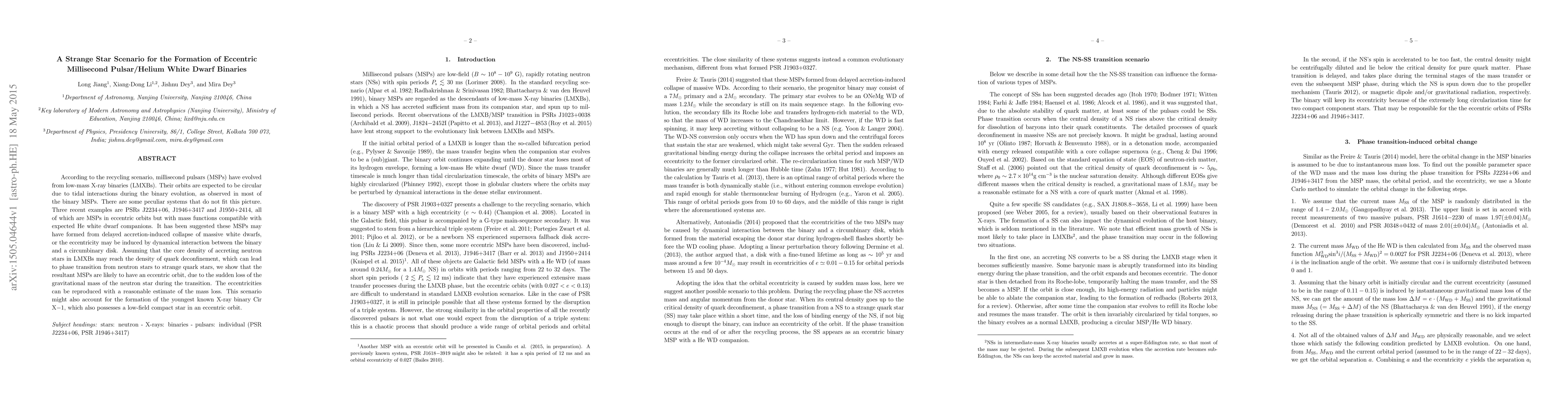 This paper explores the formation of eccentric millisecond pulsars (MSPs) in binaries through the transformation of neutron stars into strange quark stars, suggesting that the phase transition leads to significant mass loss and orbital eccentricity. This scenario could explain peculiar MSPs and the youngest known X-ray binary, Cir X-1.